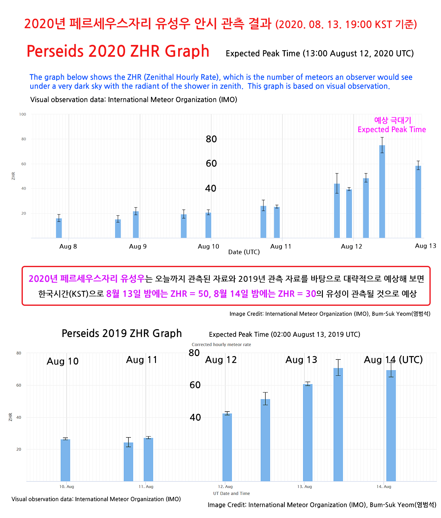 2020년 페르세우스자리 유성우는 오늘까지 관측된 자료와 2019년 관측 자료를 바탕으로 대략적으로 예상해 보면 한국시간(KST)으로 8월 13일 밤에는 ZHR = 50, 8월 14일 밤에는 ZHR = 30의 유성이 관측될 것으로 예상합니다.