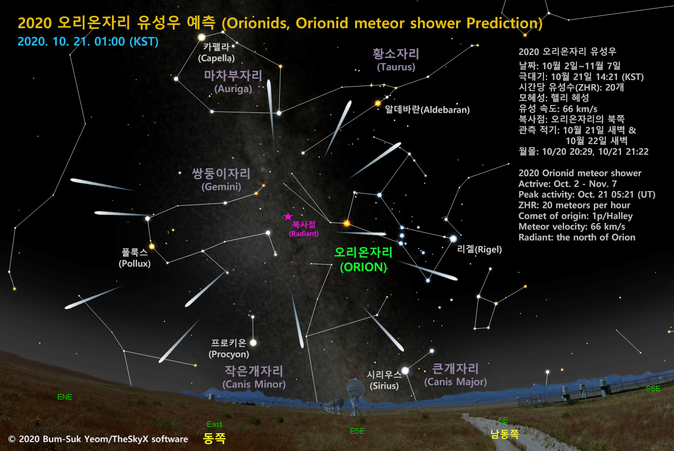 오리온자리 유성우는 10월 2일부터 11월 7일까지 주로 활동하는 유성우입니다. 올해 극대기는 10월 21일 14시 21분 (한국시간)으로 낮이므로 시간상 좋은 조건은 아닙니다. 시간당 유성수(ZHR)는 약 20개입니다. 하지만 올해는 한밤중에 달이 없는 상황이라서 평상시보다 많은 유성을 관측할 수 있을 것 같습니다.