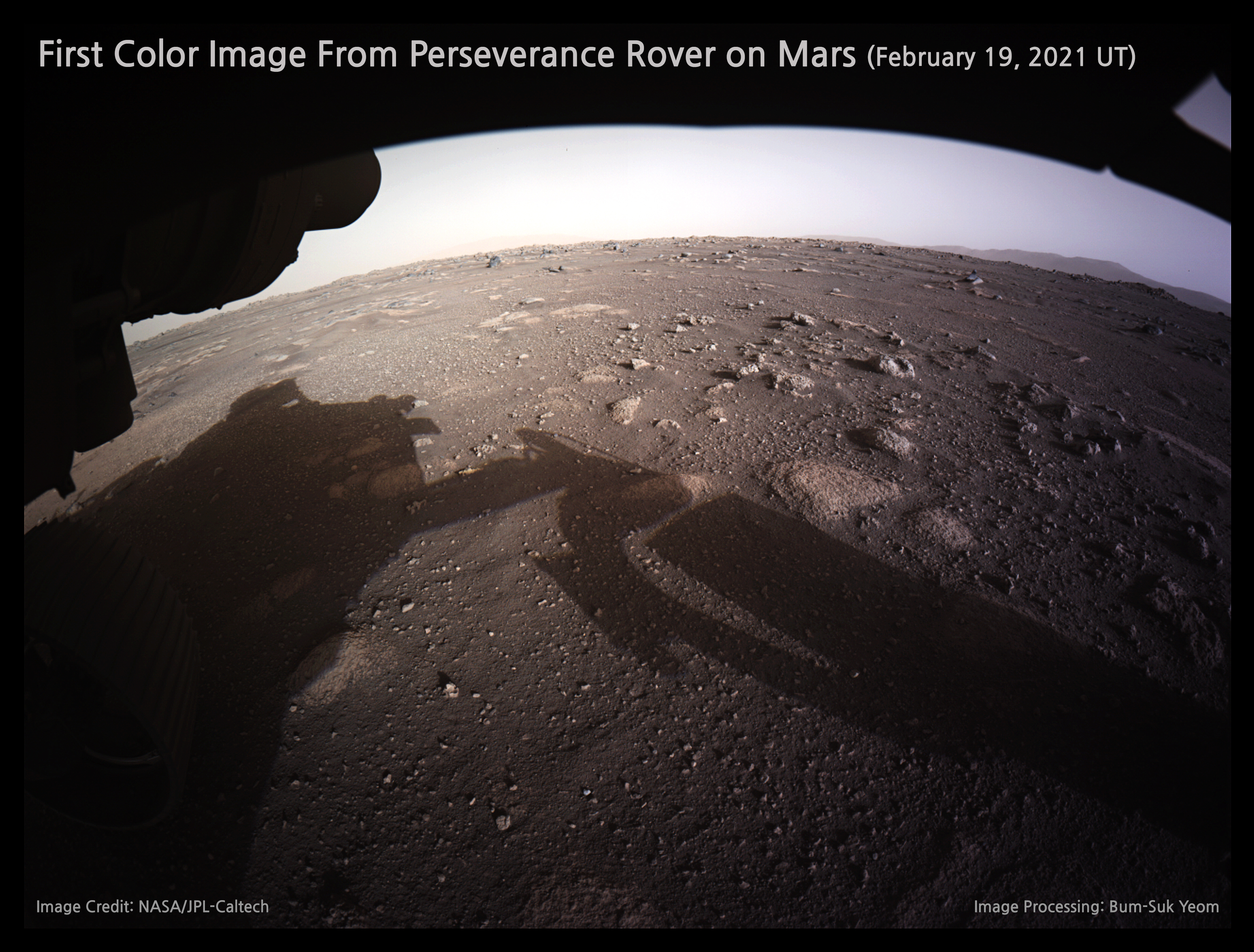 화성 탐사 로버 퍼서비어런스가 촬영한 첫번째 컬러 사진.