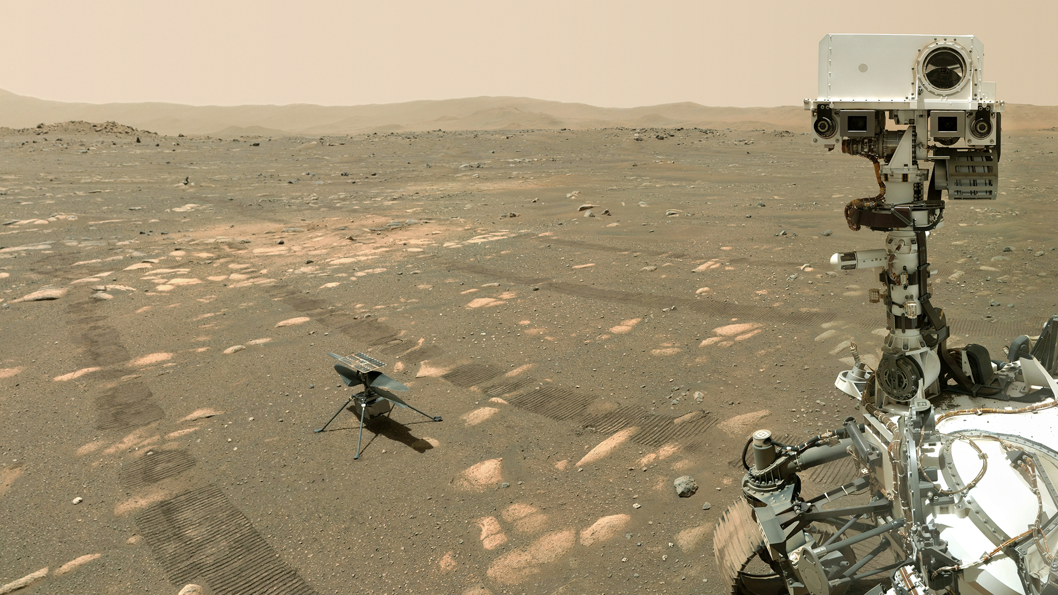 나사의 퍼서비어런스 로버(탐사차)는 인제뉴어티 헬리콥터로 셀카를 찍었다. 이 사진은 2021년 4월 6일에 로버의 긴 로봇팔 끝에 있는 셜록(SHERLOC) 장비에 장착된 왓슨(WATSON)으로 촬영한 사진입니다.