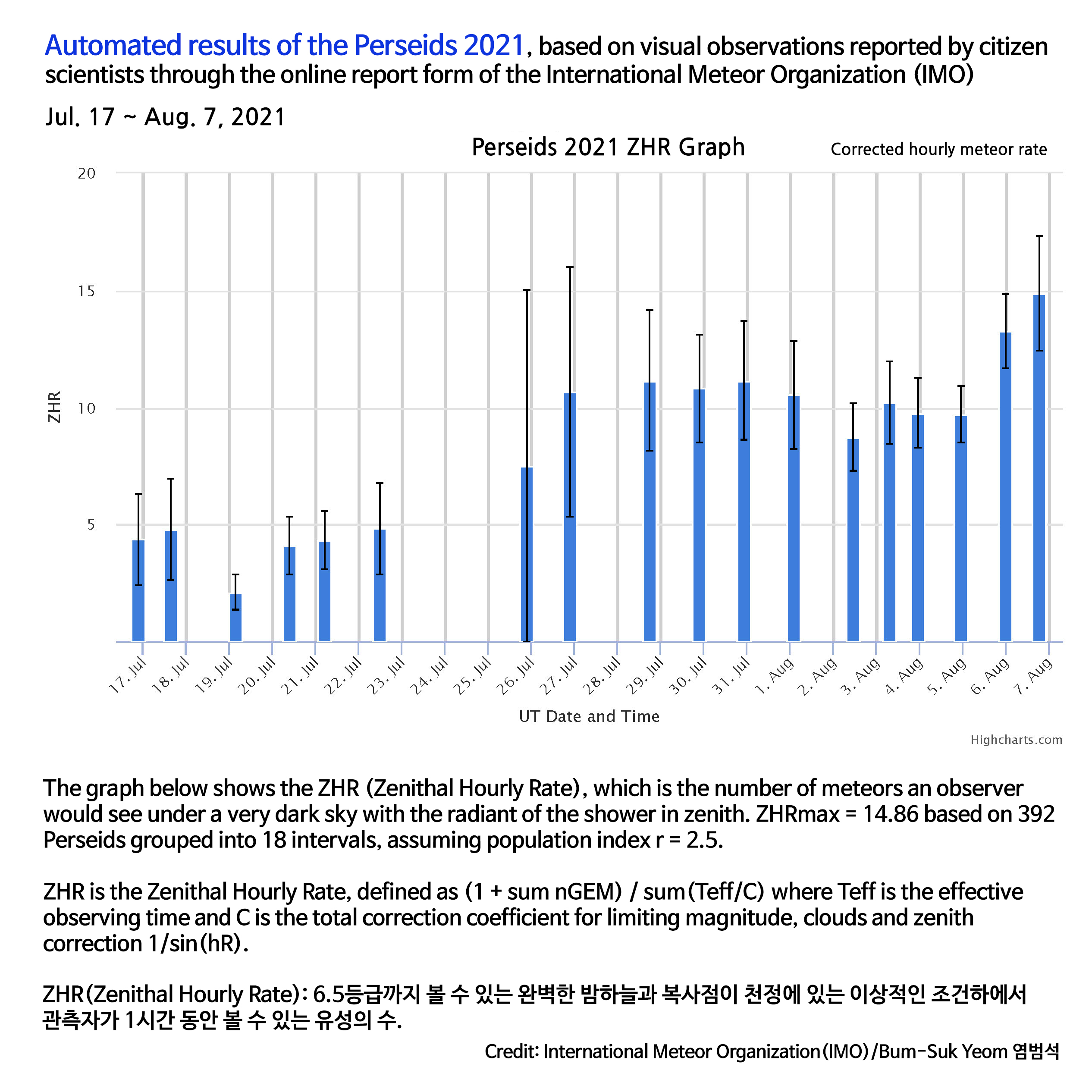 2021 페르세우스자리 유성우 실제 관측 통계.