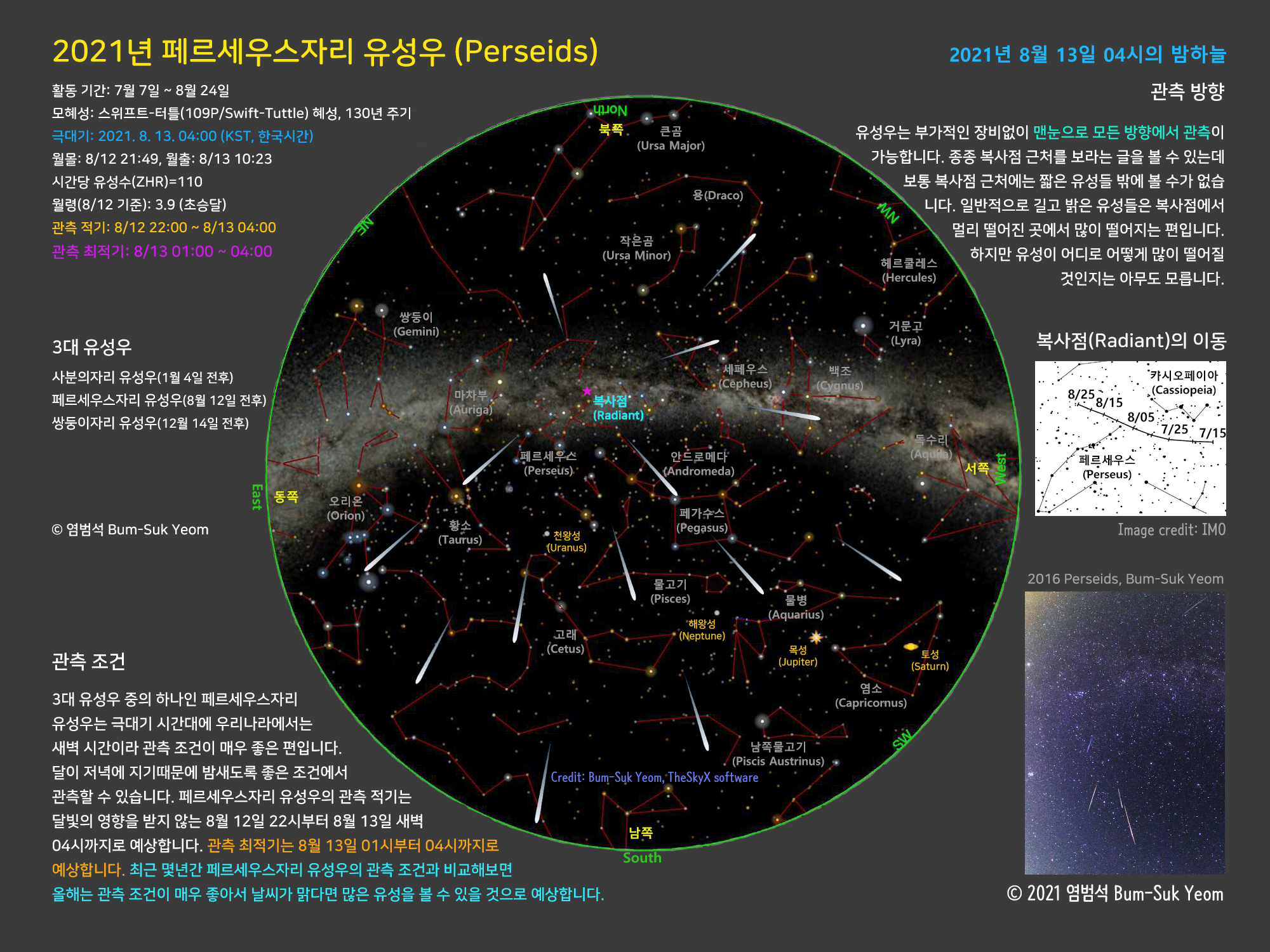 국제유성기구(International Meteor Organization, IMO)의 올해 페르세우스자리 유성우 예측에 의하면 2021년 8월 13일 04시(한국시간)에 극대기를 가지고, 시간당 110개의 유성을 볼 수 있을 것으로 예측하고 있습니다. 유성이 가장 많이 떨어지는 시간대에 우리나라는 새벽이므로 최적의 관측 장소입니다.