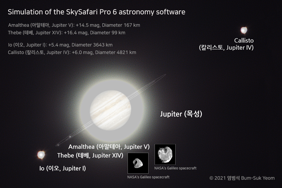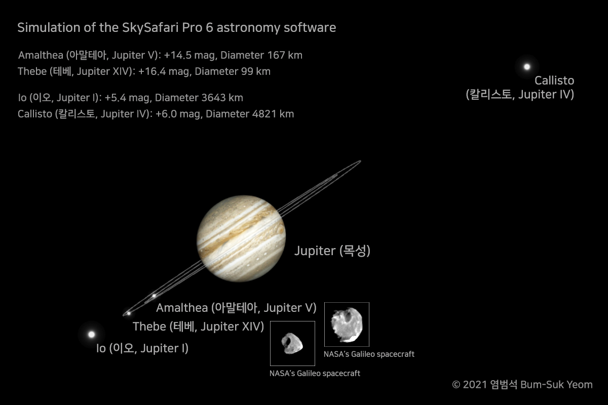 목성의 위성 아말테아(+14.5등급)와 테베(+16.4등급).