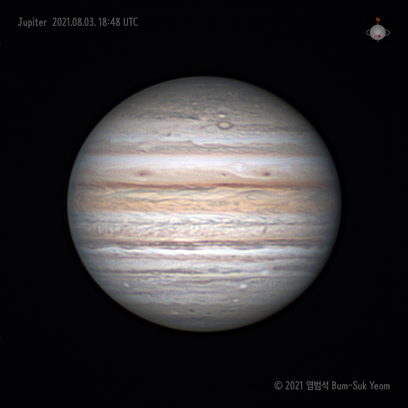 Jupiter, 2021-08-03 18:48 UT, APM Apo 12inch(304mm) f/7.5 Refractor, ZWO ASI462MC camera, Tele Vue 2.5x Powermate, ZWO ADC, Baader UV/IR cut filter, 60 sec video x 10 = 10 min, Iksan, South Korea.