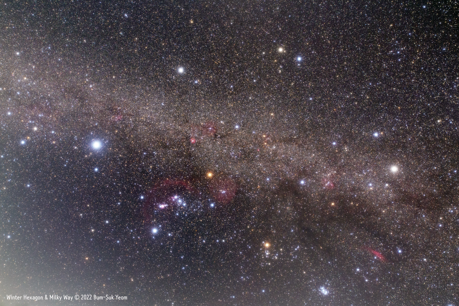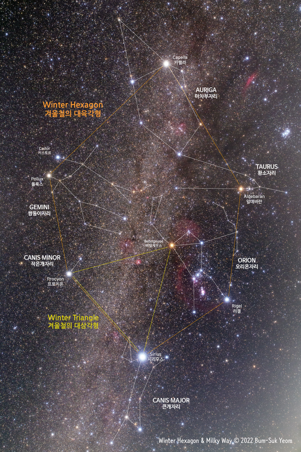 겨울철 육각형을 이루는 6개의 별은 시리우스(큰개자리), 리겔(오리온자리), 알데바란(황소자리), 카펠라(마차부자리), 폴룩스(쌍둥이자리), 프로키온(작은개자리)입니다. 또한 시리우스, 프로키온, 그리고 베텔게우스는 겨울철의 대삼각형을 이루는 별들입니다.