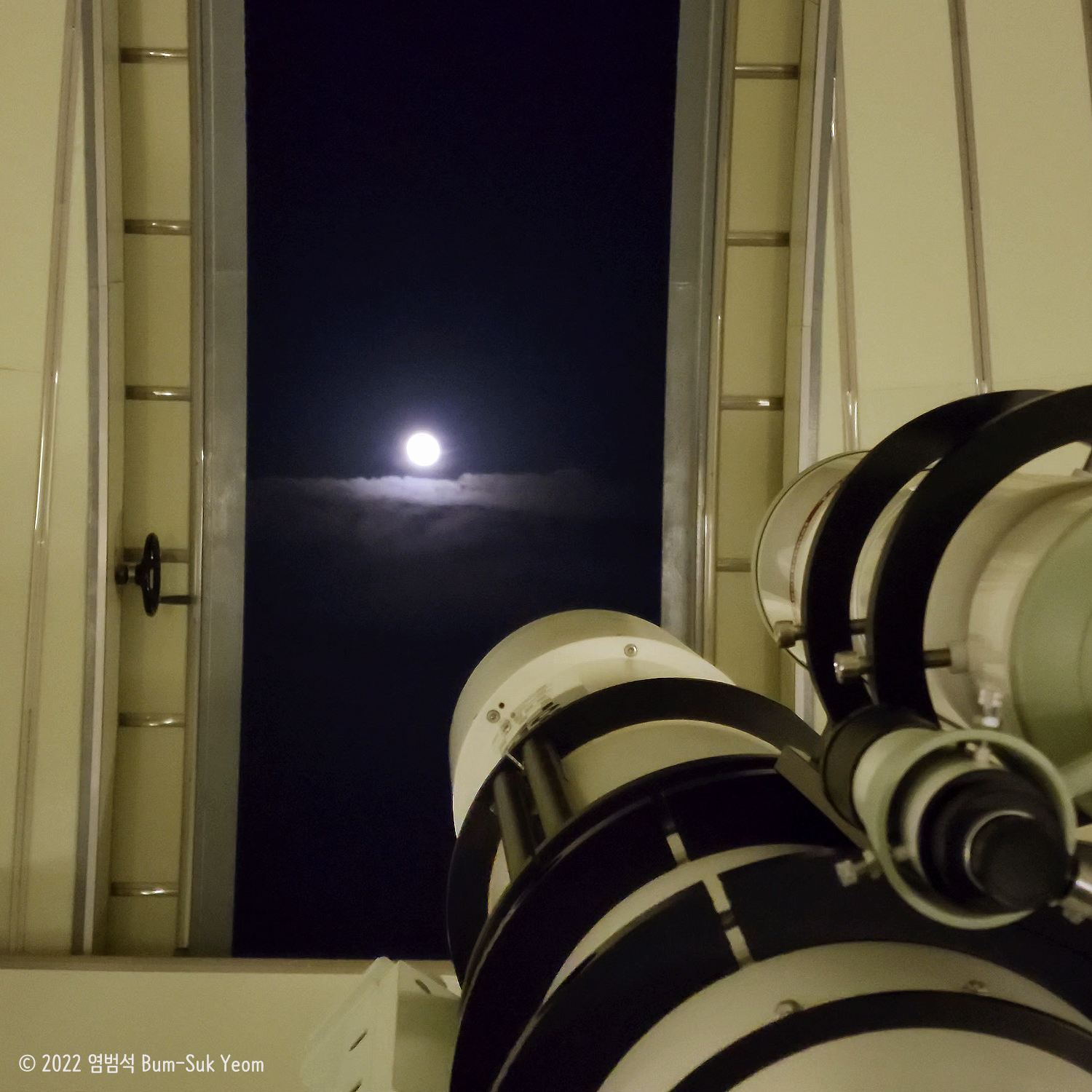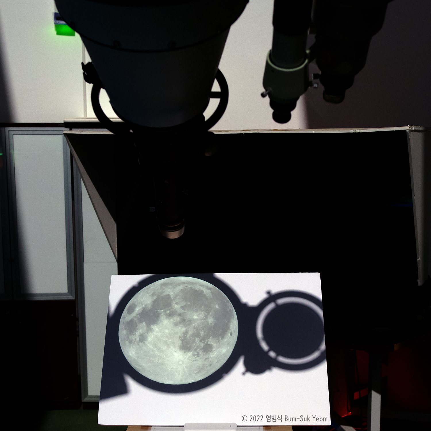 약한 구름이 있는 하늘이라 보름달이 완전 선명하게 나오지는 않았다. 망원경의 구경이 304mm(12인치)로 다른 대구경 반사망원경보다 집광력이 작아서 투영한 보름달의 크기에 제한이 있네요.