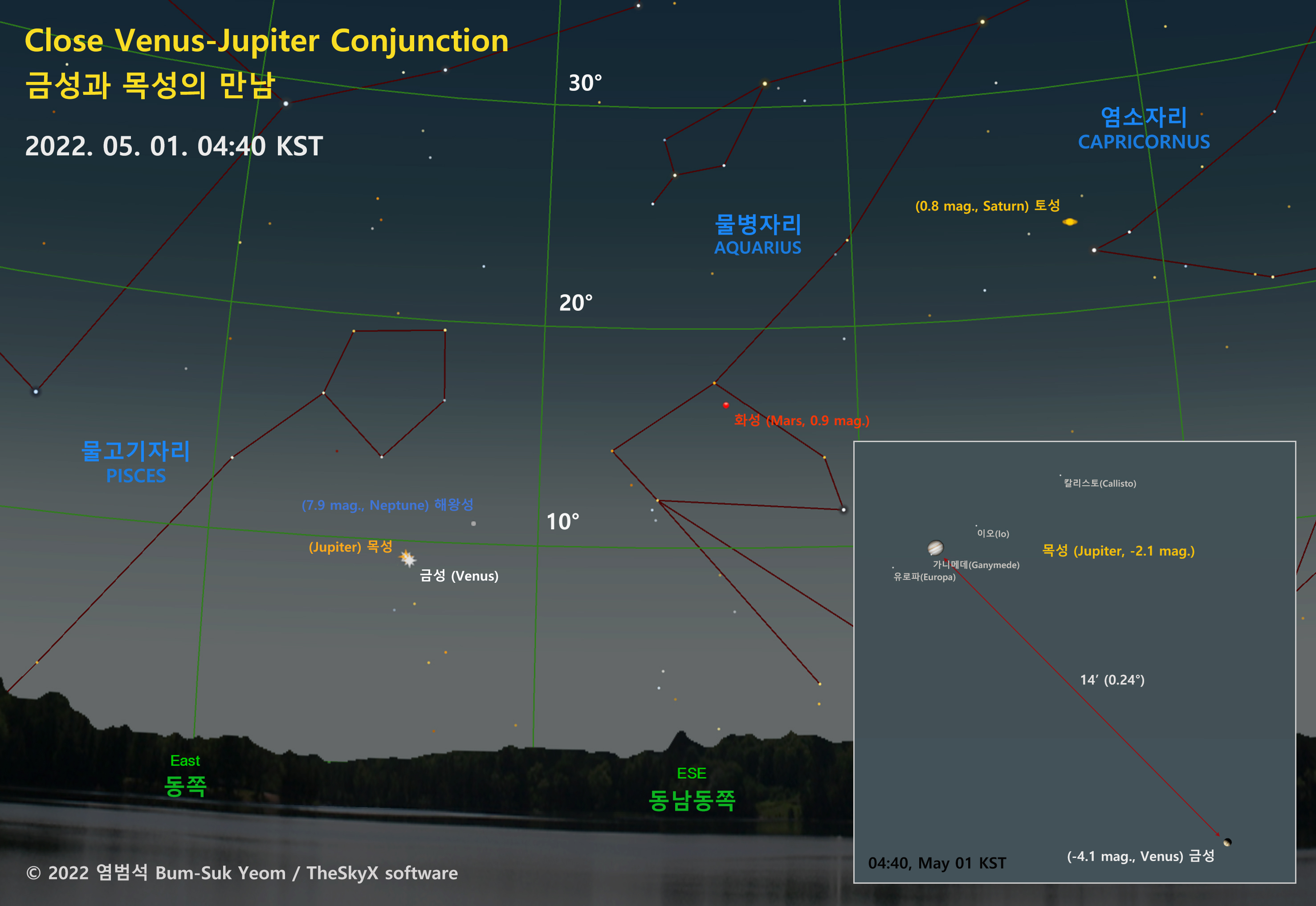 5월 1일 새벽에 금성과 목성이 매우 가까이 근접하는 천문 현상이 있습니다. 천체망원경으로 보면 두 행성을 한번에 볼 수 있습니다. 맨눈으로 본다면 두 행성이 매우 가까이 있는 것을 확인할 수 있고 핸드폰으로 촬영할 수도 있습니다. 날씨가 맑다면 기회를 놓치지 마세요. ^^