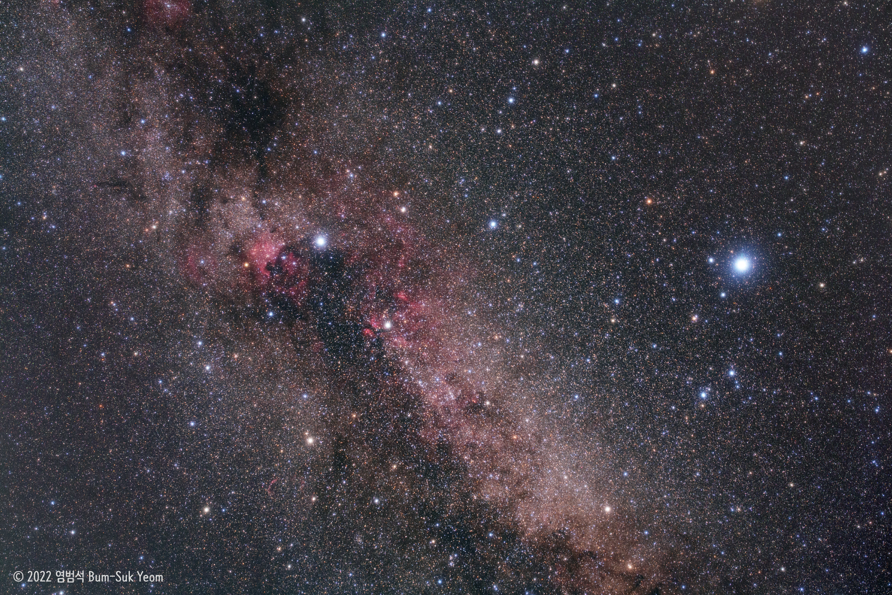 2022. 05. 05. 03:35 KST, 시그마 아트 40mm F1.4 렌즈, (필터 개조된) EOS 5D Mark III 카메라, 스카이가이더 프로 휴대용 적도의, f/4.5, ISO 1600, 옵토롱 클리어 스카이 필터 (82mm) & 리 소프트 1번 필터, 노출시간 300초 x 10장 = 50분, 전라북도 장수군, 염범석. 다크 & 플랫 이미지 보정 안함.