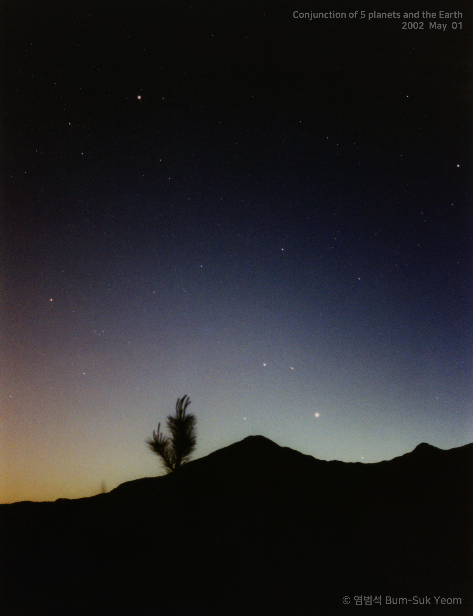 Taken by Bum-Suk Yeom ( www.cometsky.com ) on May 01, 2002 UTC @ Gapyeong, Gyeonggi-do, South Korea. Details: 11:22 UTC (20:22 May 01 KST), Nikkor 28mm F2.8 lens with Nikon FM2 film camera, Manfrotto 190CL tripod, ISO 400, Fuji 400 film, f/2.8, 20 sec, Bum-Suk Yeom.