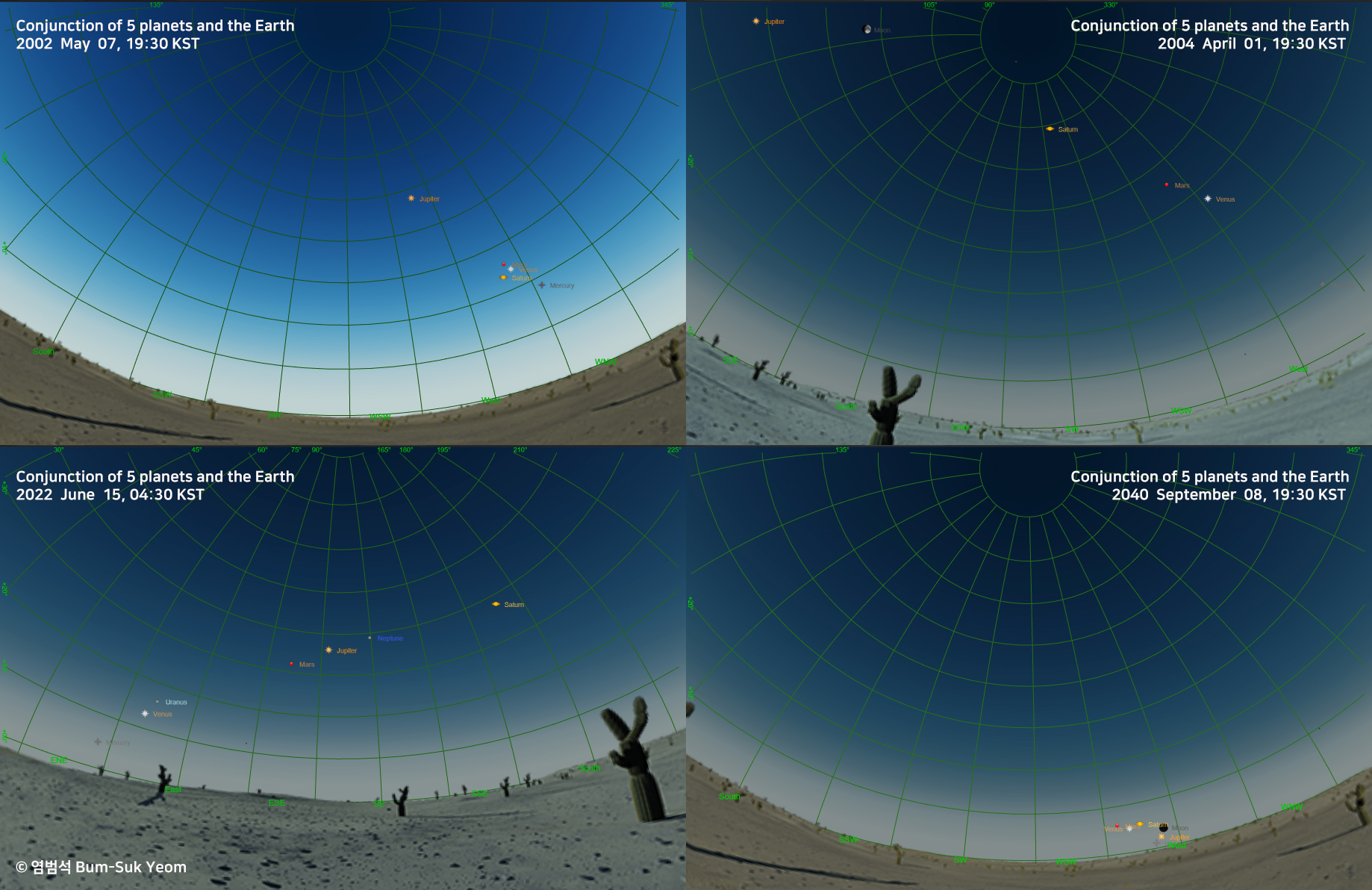 계산상으로는 14mm 렌즈에 플프레임(FF) 카메라를 사용했을 때 구도를 잘 맞추면 한 화면에 오행성을 촬영할 수 있을 것 같긴하네요.