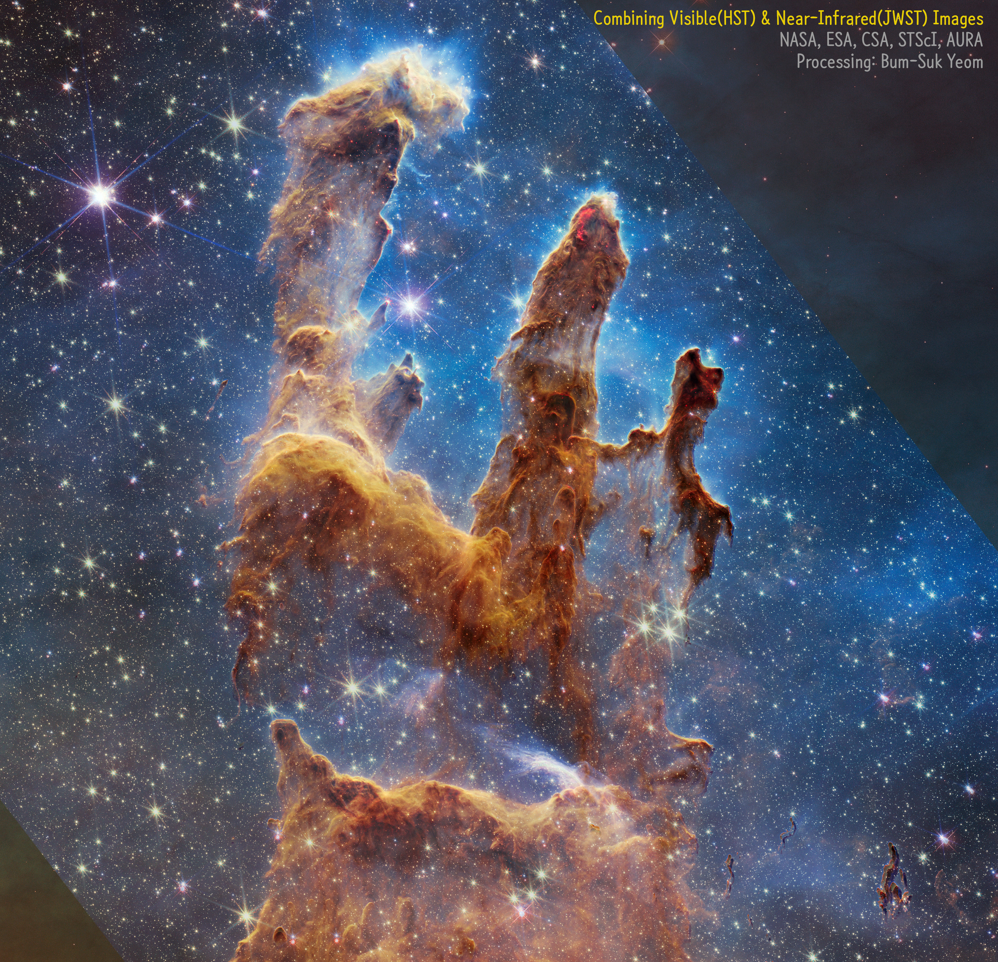 이 이미지는 가시광선과 근적외선 이미지를 결합한 독수리 성운(M16)의 기둥을 촬영한 것이다. 가시광선 이미지는 허블우주망원경(HST)이 촬영하였고, 근적외선 이미지는 제임스 웹 우주 망원경(JWST)이 촬영하였다.