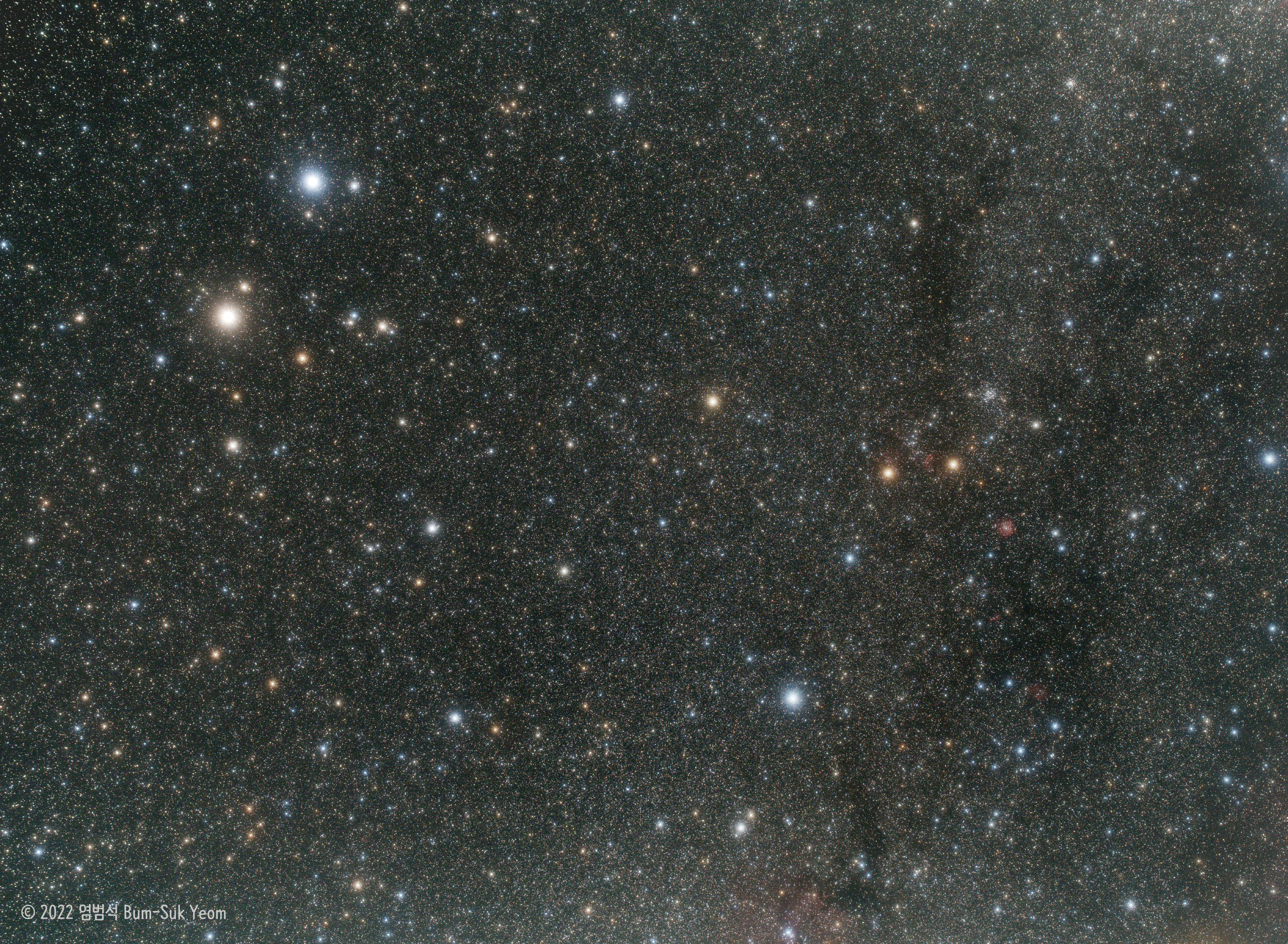 2022. 11. 27. 03:53 KST, 시그마 아트 40mm F1.4 렌즈, ASI6200MC Pro 카메라, 스카이트래커 휴대용 적도의, f/5.6, 82mm 옵토롱 클리어스카이 필터, 리 소프트 1번 필터, 게인 300, 노출시간 180초 x 21장 = 63분, 전라북도 남원, 염범석 Bum-Suk Yeom.