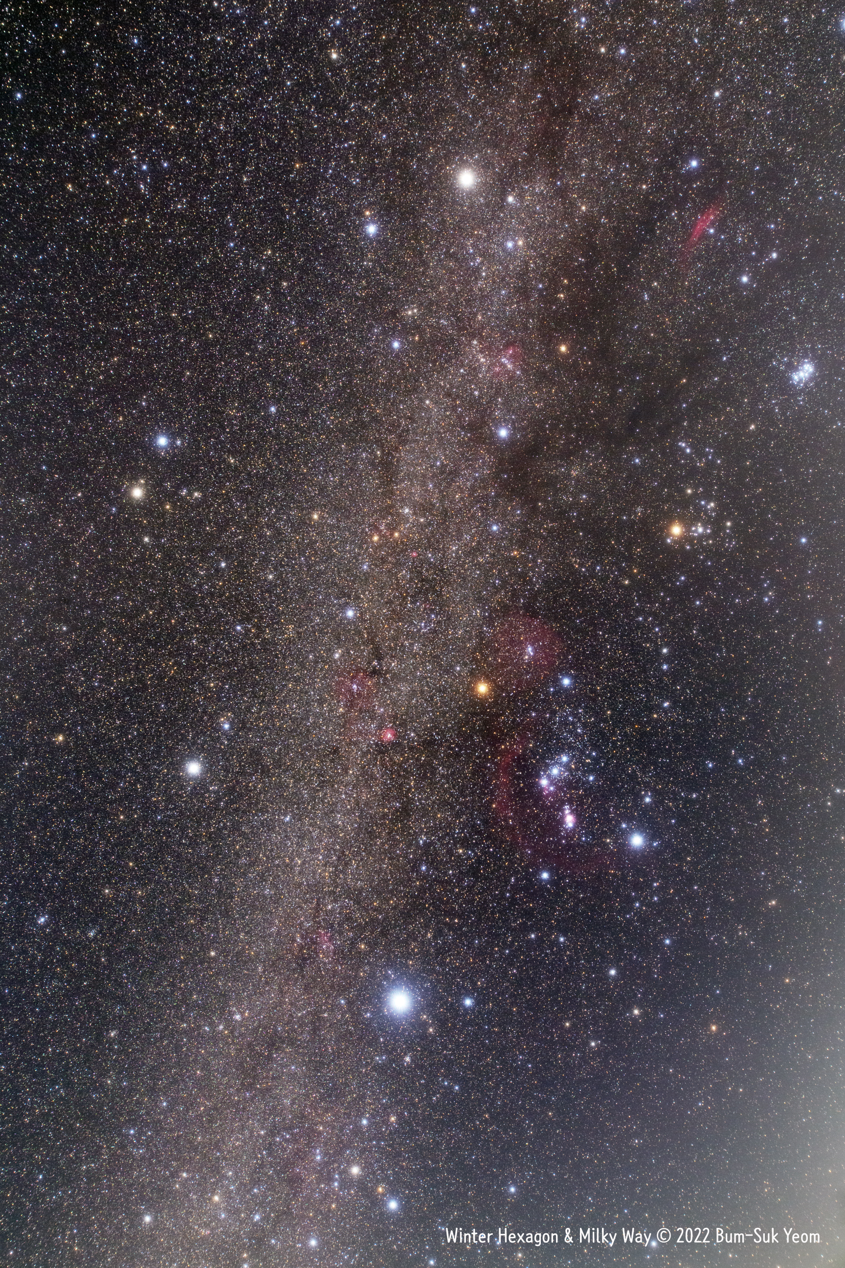 겨울철의 주요 별자리. 겨울철의 대육각형과 은하수.