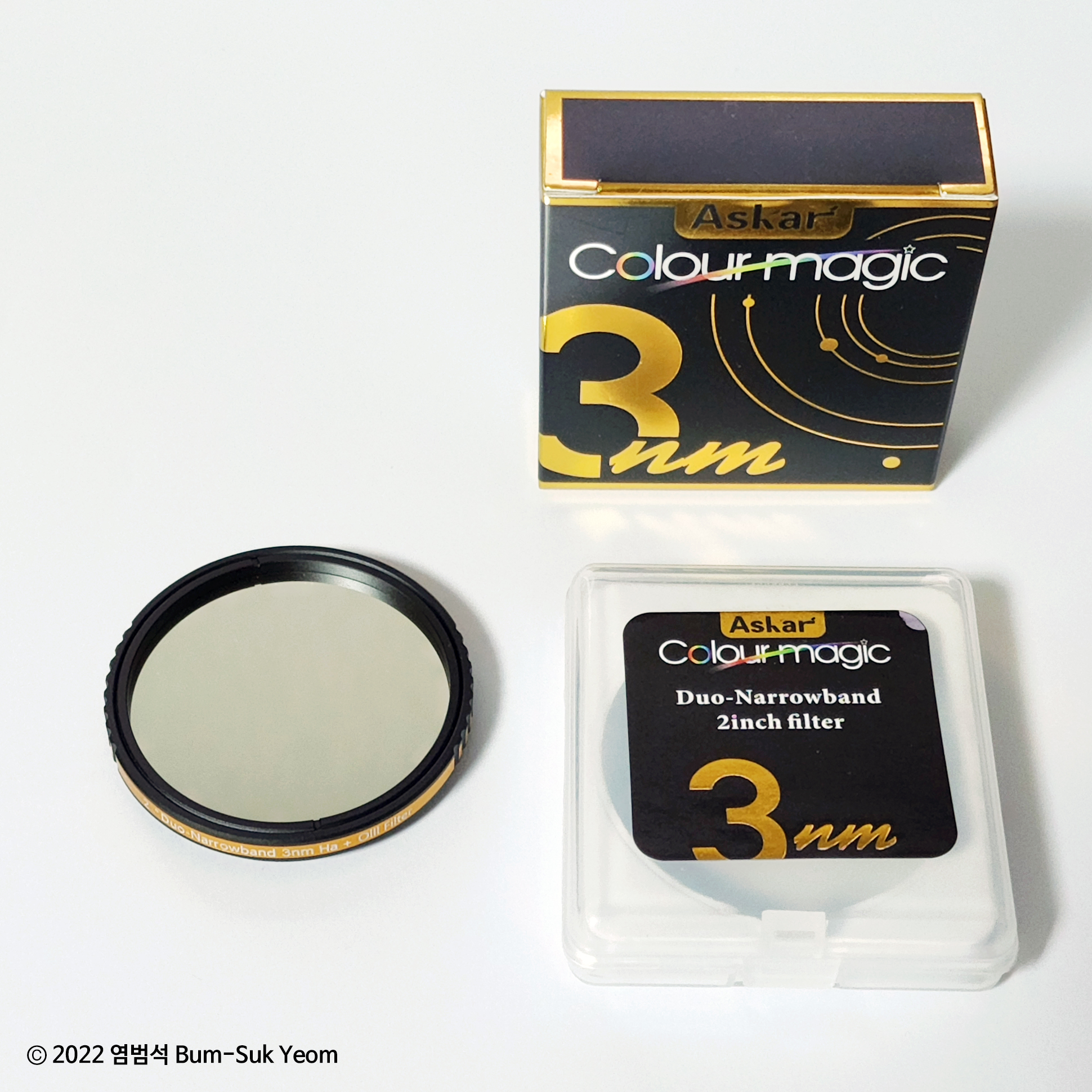 기존에 출시된 3nm 필터중에서 밝은 별의 헤일로(halo) 억제가 가장 좋다고 해서 구입을 했다. 이 필터는 도심의 광해를 대부분 차단하기때문에 도심에서도 좋은 사진을 얻을 수 있을 것이다. 아직 해외 사용기가 없어서 성능이 어떨지는 장담할 수 없으나 좋은 성능을 보여줄 것으로 기대한다. 옵토롱 L-Ultimate 필터와 한동안 고민하다가 결국 아스카 필터를 구입 (두 필터를 비교한 리뷰글에서 아스카 필터가 헤일로 억제가 좀 더 좋다는 평가를 보고...).