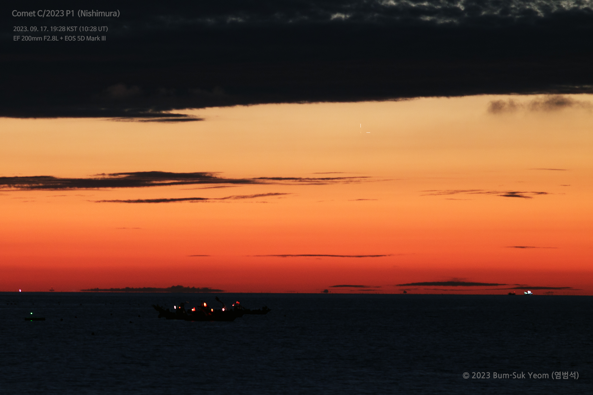 Taken by Bum-Suk Yeom ( www.cometsky.com ) on September 17, 2023 UTC @ Seocheon, Chungcheongnam-do, South Korea. Details: 10:28 UT (19:28 KST), Canon EF 200mm F2.8 lens, (Filter modified) EOS 5D Mark III camera, Manfrotto MT055 tripod, ISO 1600, f/4.0, 1 sec exposure time, Bum-Suk Yeom.