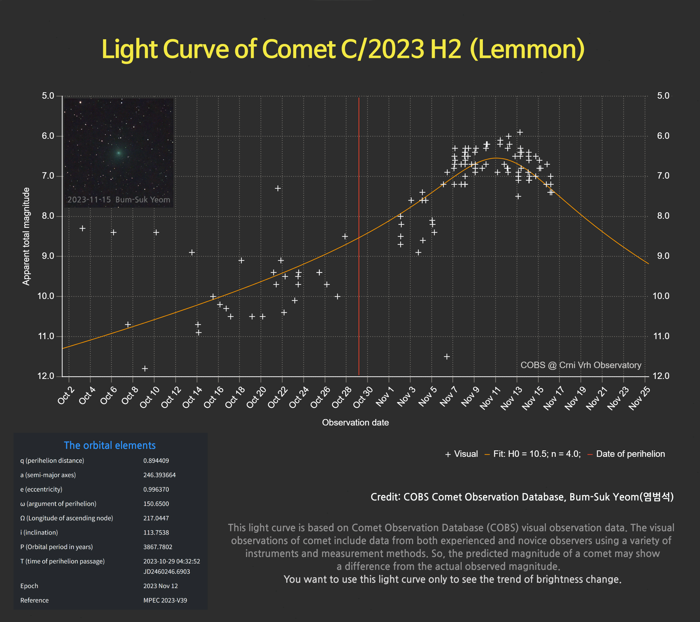 C/2023 H2 (레몬) 혜성의 광도 곡선.