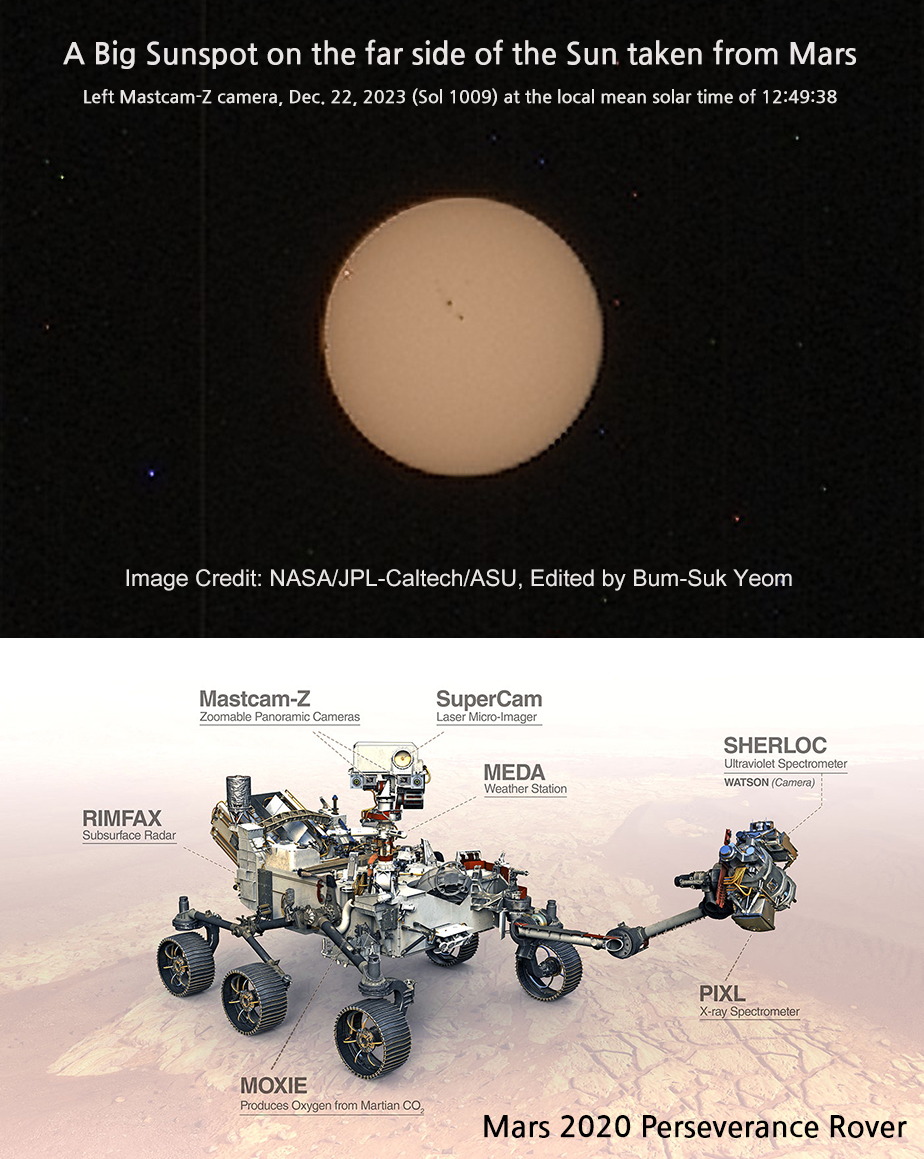 NASA의 화성 탐사차인 퍼서비어런스 로버가 왼쪽 Mastcam-Z 카메라를 사용하여 태양 사진을 촬영했다. 이 태양 사진은 2023년 12월 22일(솔 1009일) 현지 평균 태양시 12시 49분 38초에 촬영하였다. 우리는 12월 31일 전후로 지구에서 이 거대한 흑점을 관측할 것으로 예상한다.