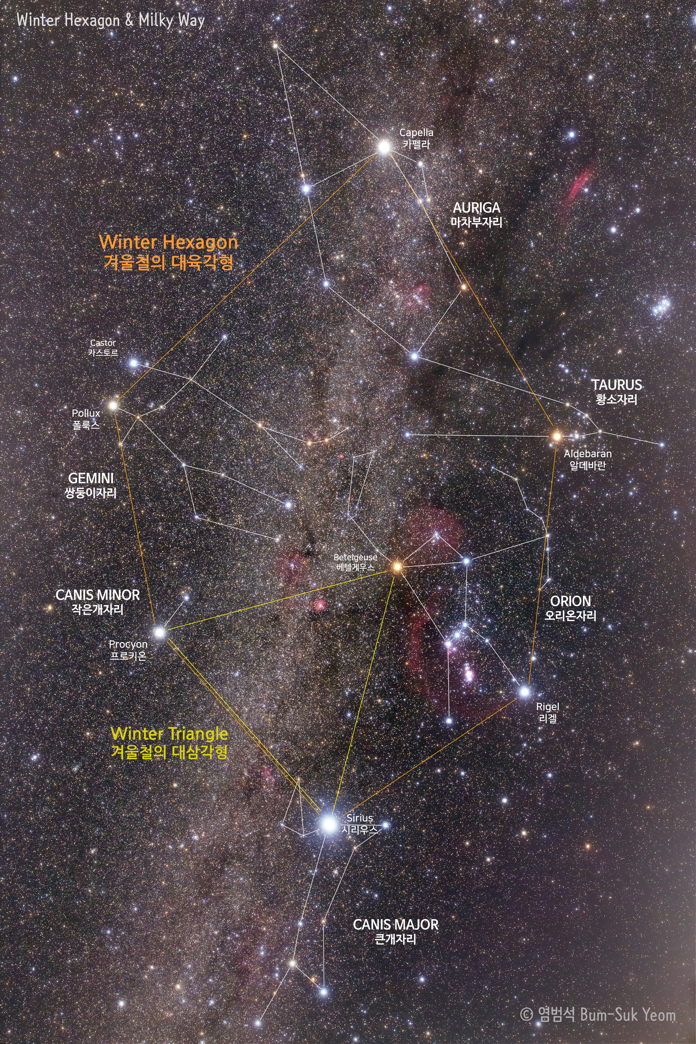 겨울철 육각형을 이루는 6개의 별은 시리우스(큰개자리), 리겔(오리온자리), 알데바란(황소자리), 카펠라(마차부자리), 폴룩스(쌍둥이자리), 프로키온(작은개자리)입니다. 또한 시리우스, 프로키온, 그리고 베텔게우스는 겨울철의 대삼각형을 이루는 별들입니다.