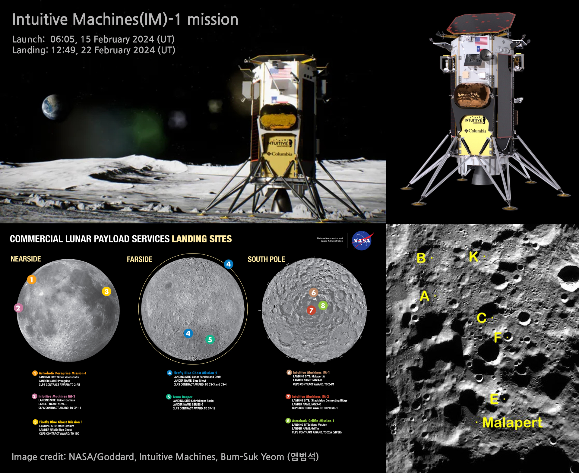 2월 15일 목요일에 발사된 Intuitive Machines의 Nova-C급 (오디세우스) 달 착륙선은 2월 23일 금요일 07:49 (한국시간)에 Malapert A로 알려진 달 지형 근처의 달 남극 지역에 착륙할 예정입니다. 이 지역은 비교적 평평하고 안전한 지역입니다. 지구에서 볼 수 있는 달의 측면에 있는, 분화구가 많은 남쪽 고지대 내에 있습니다. Malapert A 근처에 착륙하면 임무 계획자가 달 지평선에서 지구가 낮은 위치에서 지구로 통신하고 데이터를 다시 전송하는 방법을 이해하는 데 도움이 됩니다.