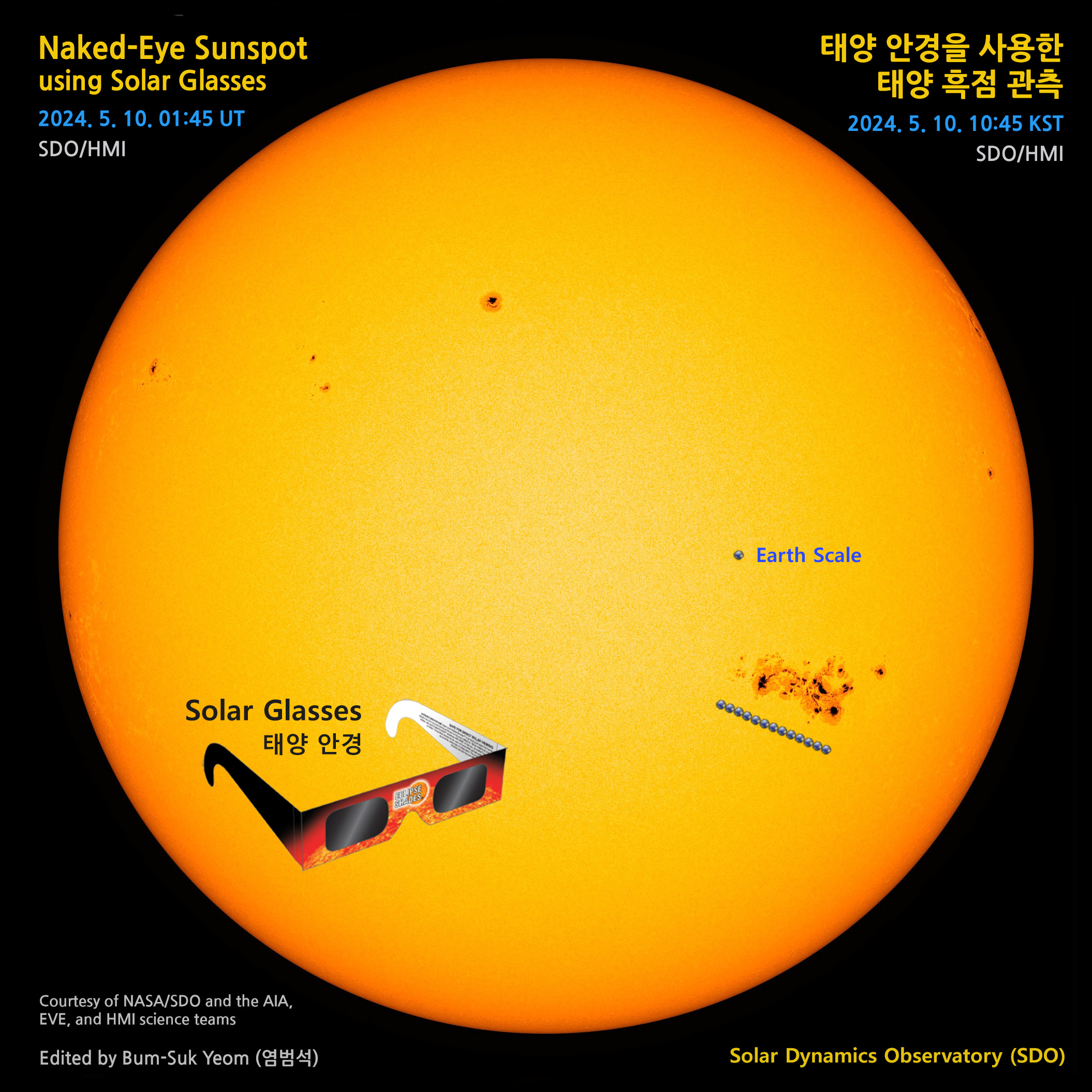 | Naked-Eye Giant Sunspot using Solar Glasses (or Solar Filter) 태양 안경을 사용하여 맨눈으로 관측 가능한 큰 태양 흑점 (0) | 2024.05.09 |