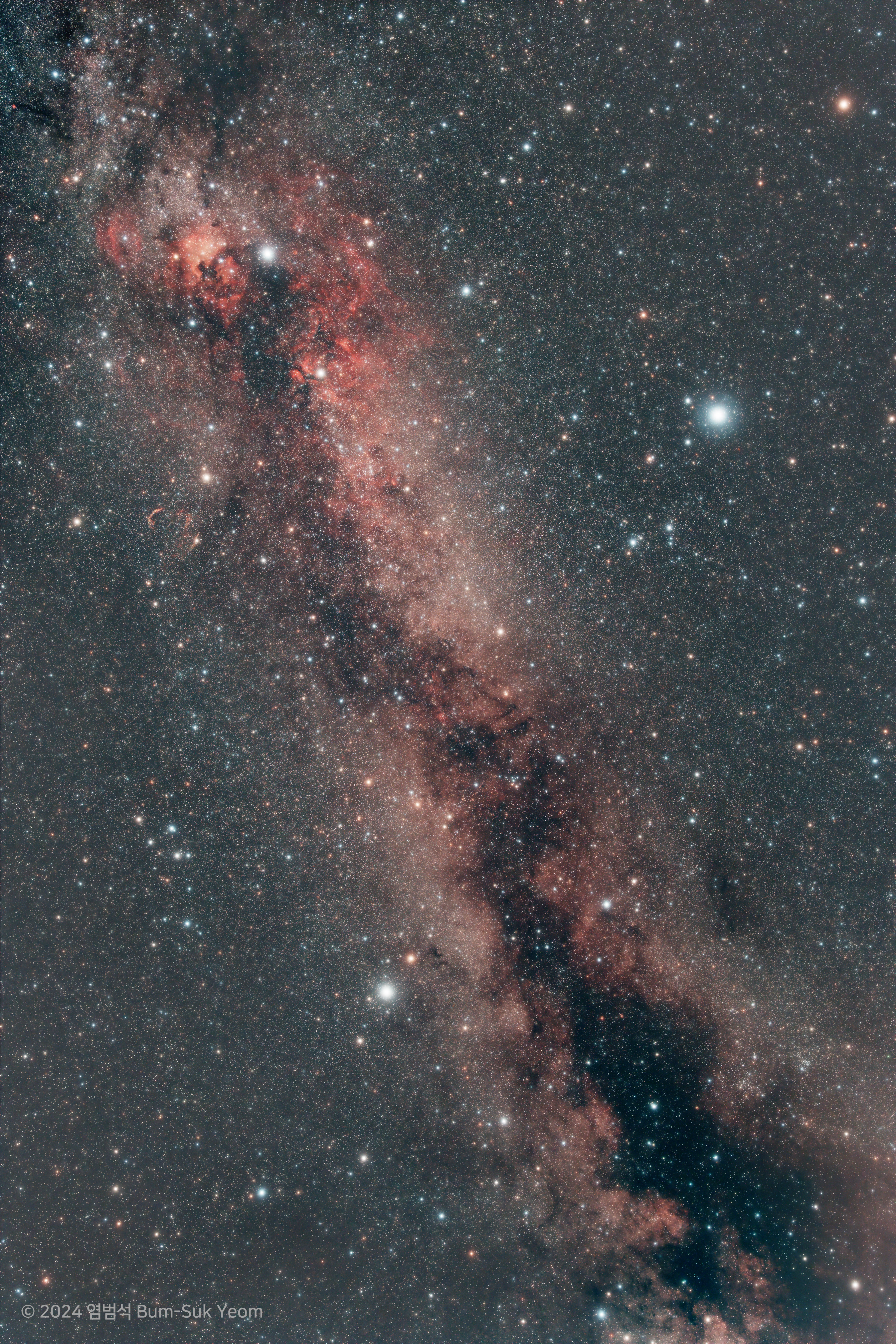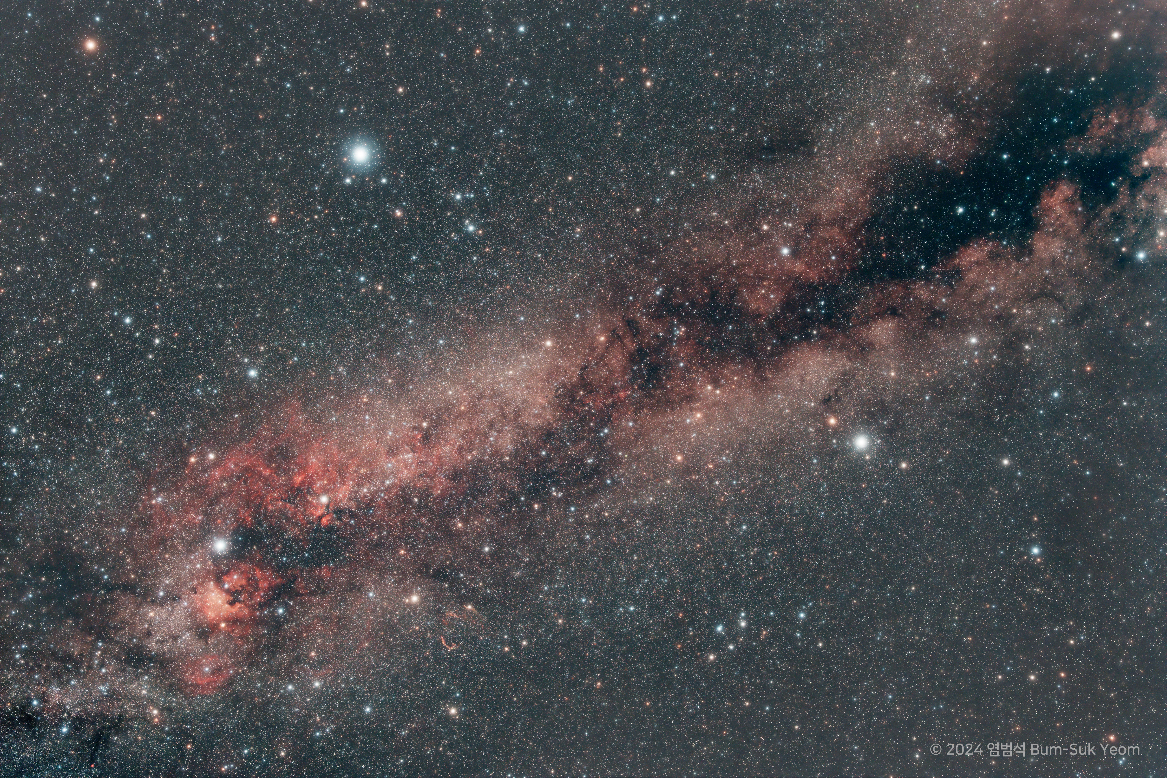 2024. 06. 10. 02:12 KST, 시그마 아트 28mm F1.4 렌즈, ZWO ASI6200MC Pro 카메라, iOptron HAE43 하모닉 적도의, 안틀리아 Triband RGB 울트라 필터, 리 소프트 1번 필터, f/4, 게인 200, 옵셋 50, 150초 x 20장 = 50분 노출, 전북특별자치도 장수군, 염범석 Bum-Suk Yeom.