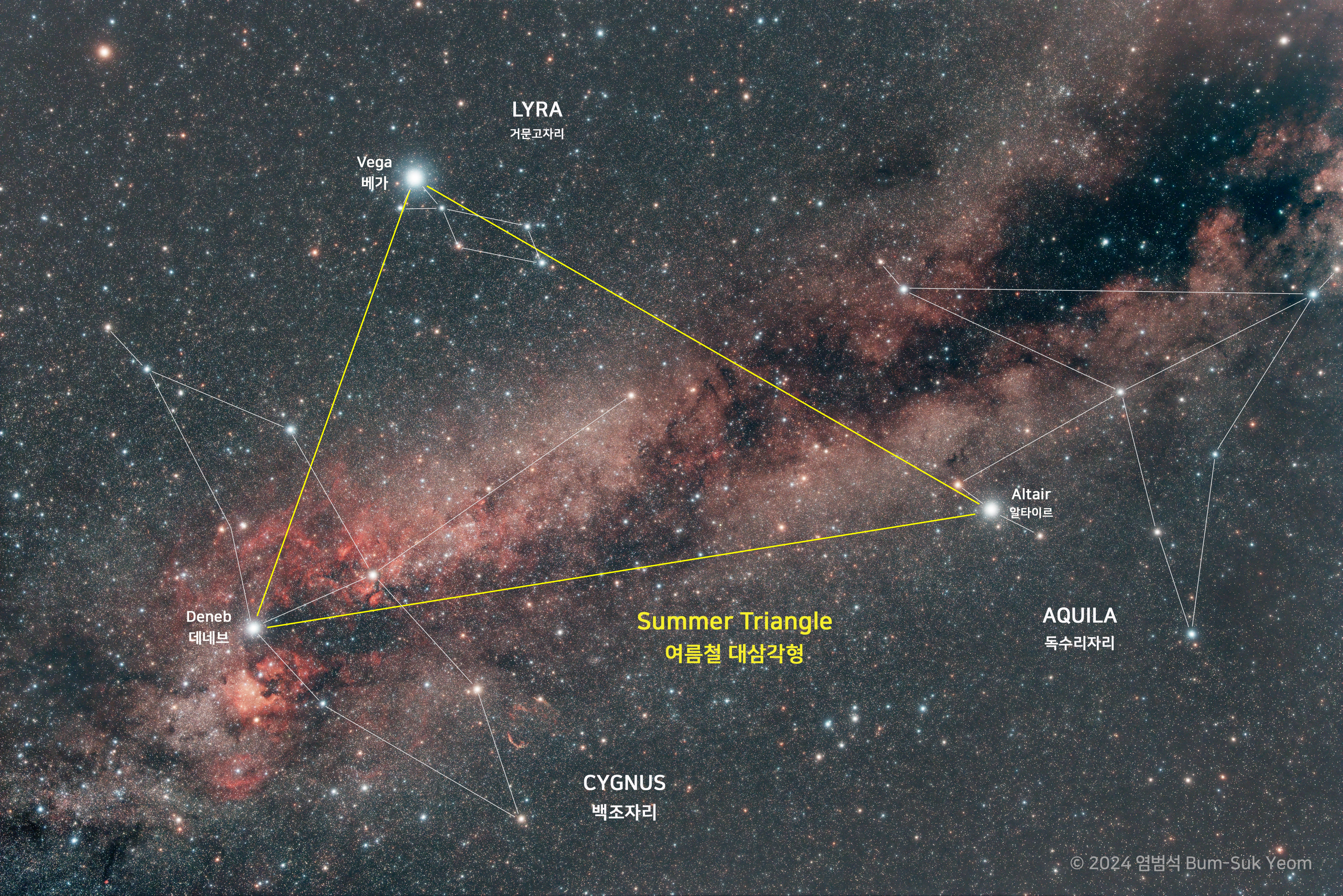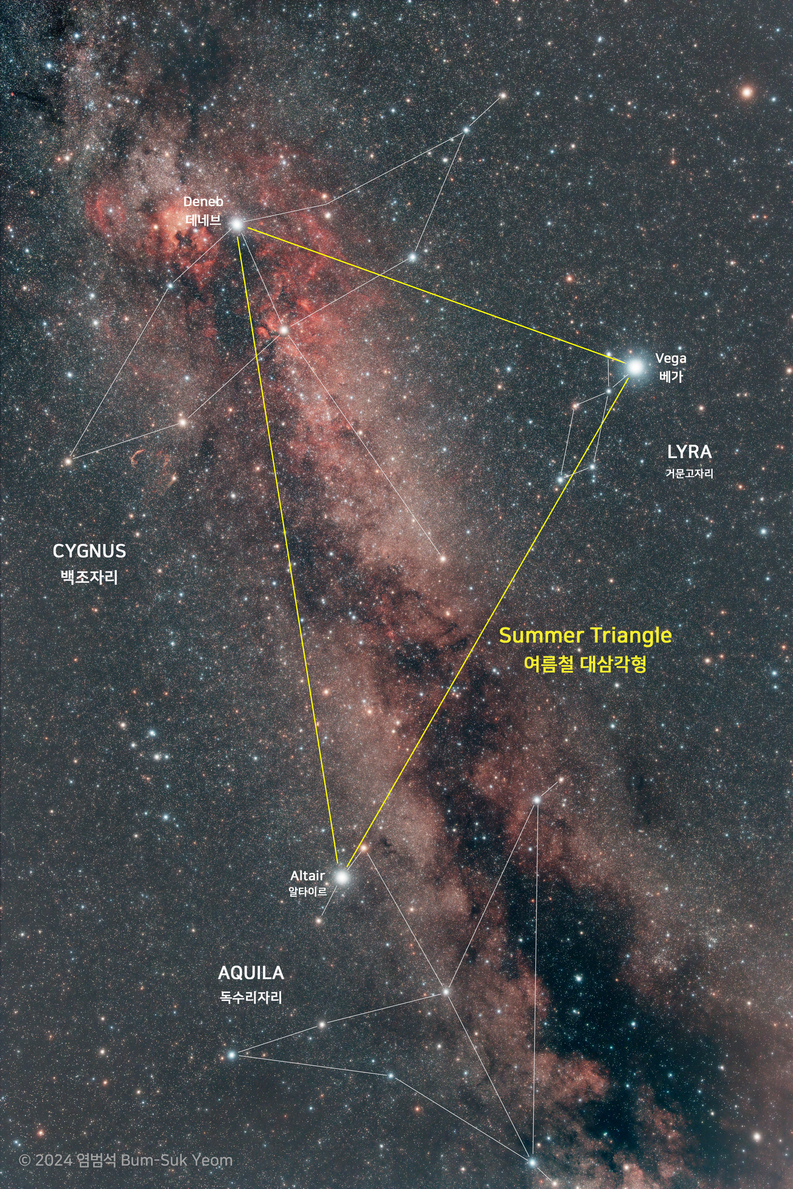 여름철 대삼각형은 거문고자리의 베가(직녀), 백조자리의 데네브, 그리고 독수리자리의 알타이르(견우)가 이루는 삼각형을 말합니다. 데네브(Deneb)는 사진의 왼쪽 아래에 있고, 여름철 대삼각형의 가장 밝은 별인 베가(Vega, 직녀)는 사진의 왼쪽 위에 있으며, 알타이르(Altair, 견우)는 중앙의 오른쪽에서 볼 수 있습니다.