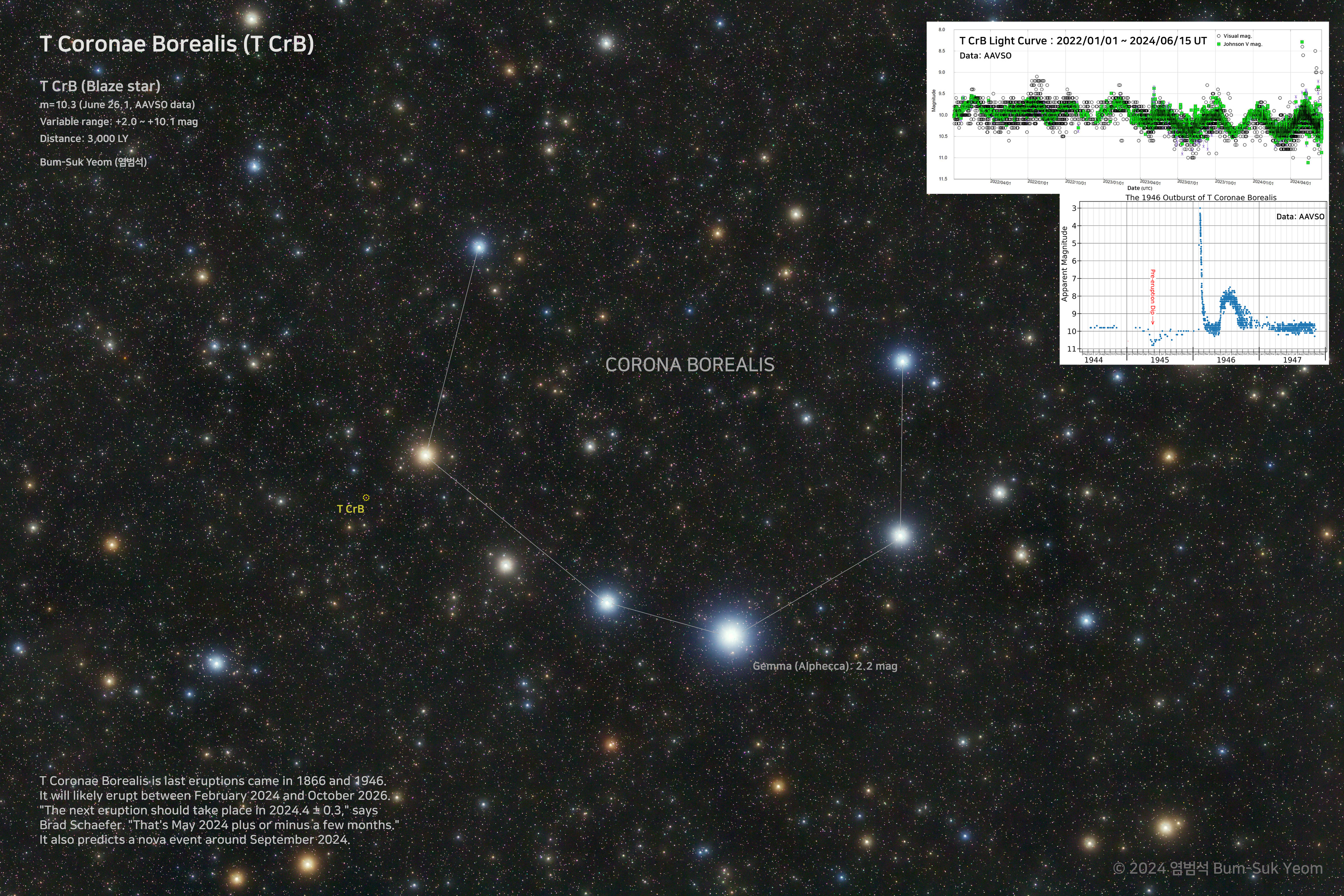 T Coronae Borealis (T CrB, Blaze star) is last eruptions came in 1866 and 1946. It will likely erupt between February 2024 and October 2026. "The next eruption should take place in 2024.4 ± 0.3," says Brad Schaefer. "That's May 2024 plus or minus a few months." It also predicts a nova event around September 2024.