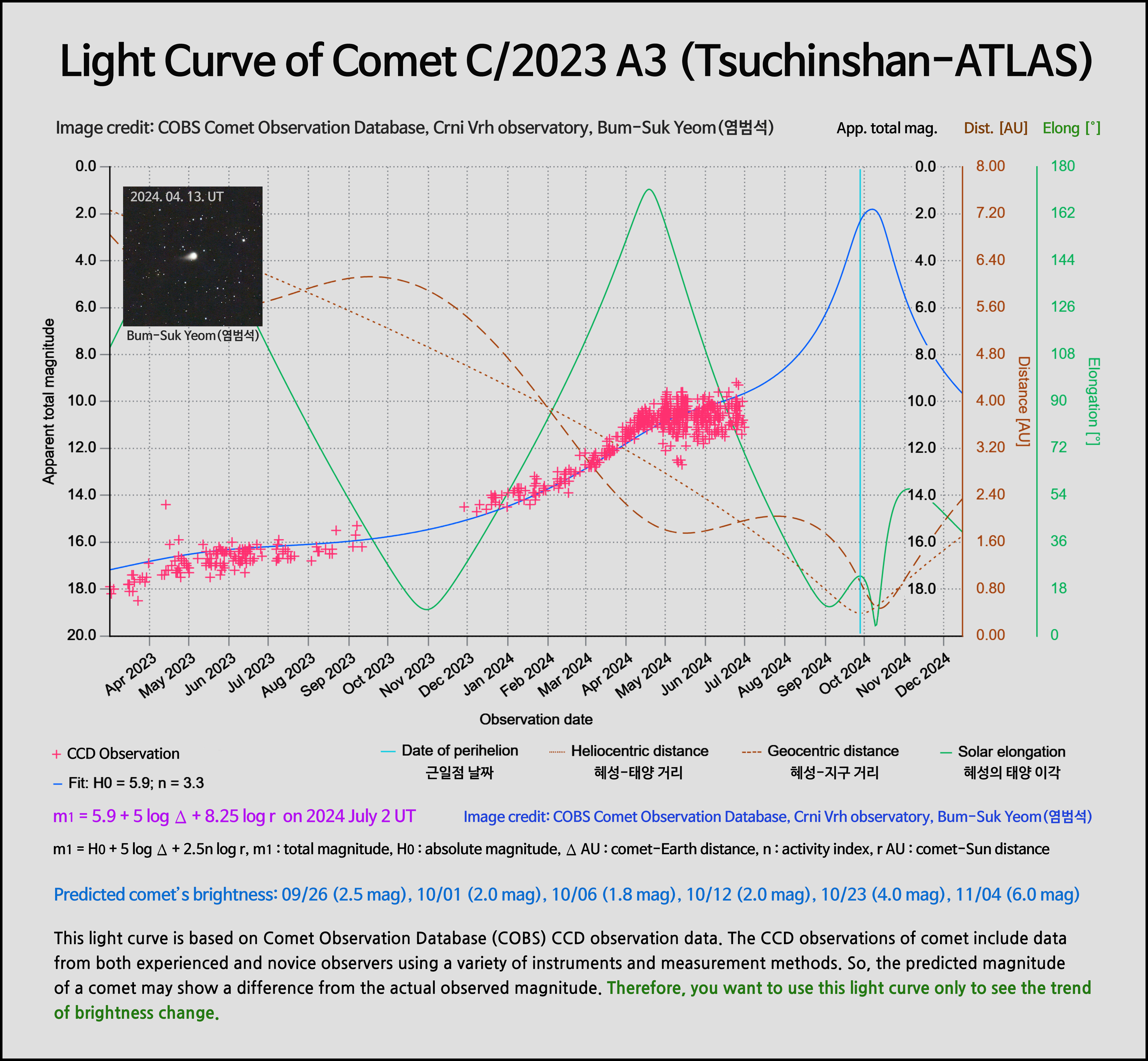 이 광도 곡선은 COBS의 CCD 관측 데이터를 사용한 것입니다. 혜성의 CCD 관측은 다양한 장비들과 측정 방법들을 사용하여 숙련된 관찰자와 초보 관찰자 모두의 자료를 포함합니다. 그래서 혜성의 예상 등급은 실제로 관측했을 때의 등급과 차이를 보여줄 수도 있습니다. 따라서 당신은 이 광도 곡선을 단지 밝기 변화의 경향성을 보는 데 사용하기 바랍니다.