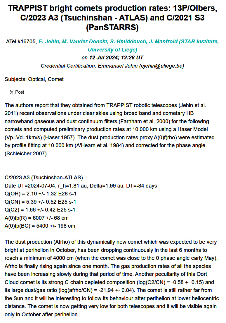 ATel #16705; E. Jehin, M. Vander Donckt, S. Hmiddouch, J. Manfroid (STAR Institute, University of Liege) on 12 Jul 2024; 12:28 UT. Credential Certification: Emmanuel Jehin (ejehin@uliege.be).