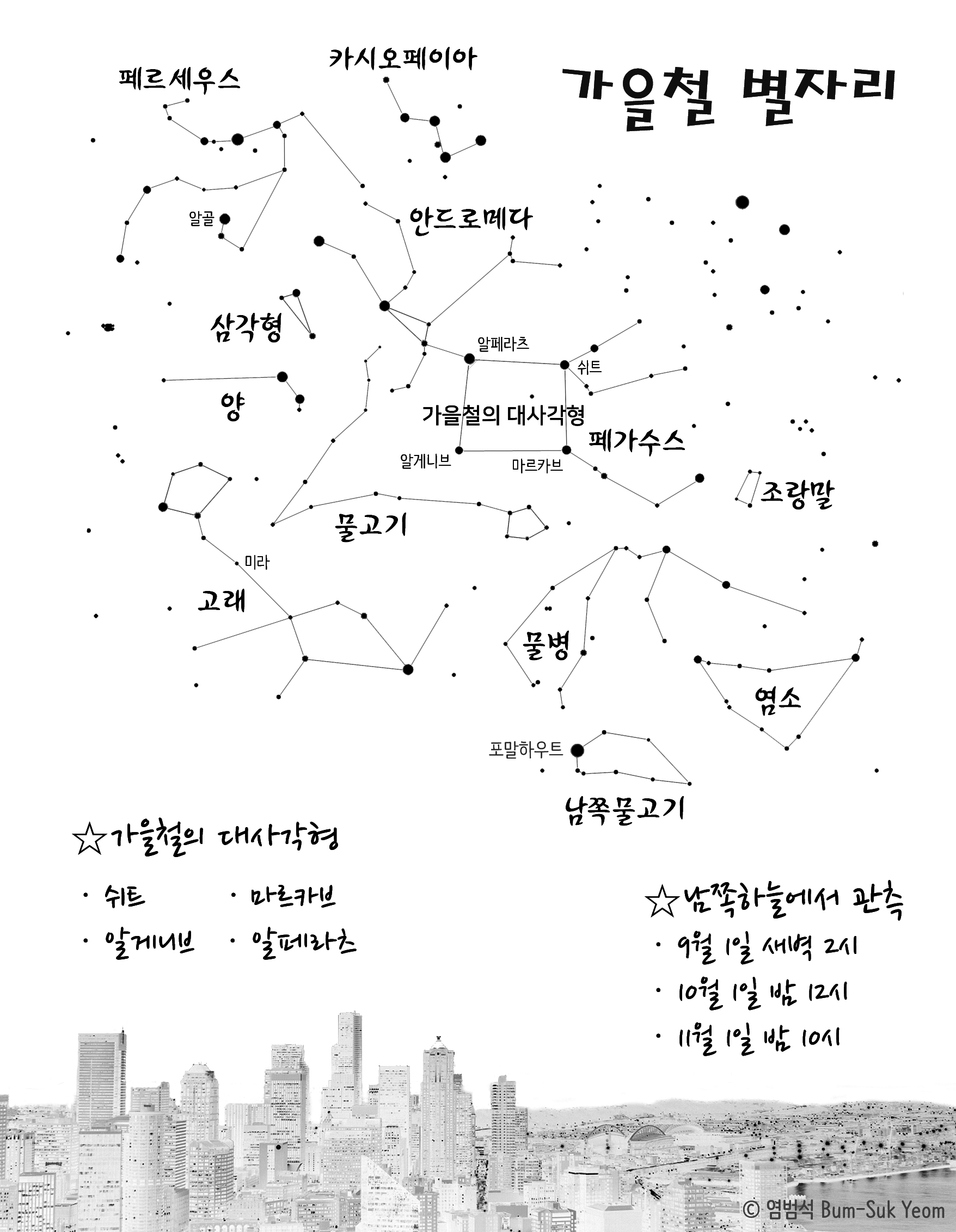 가을철의 주요 별자리.