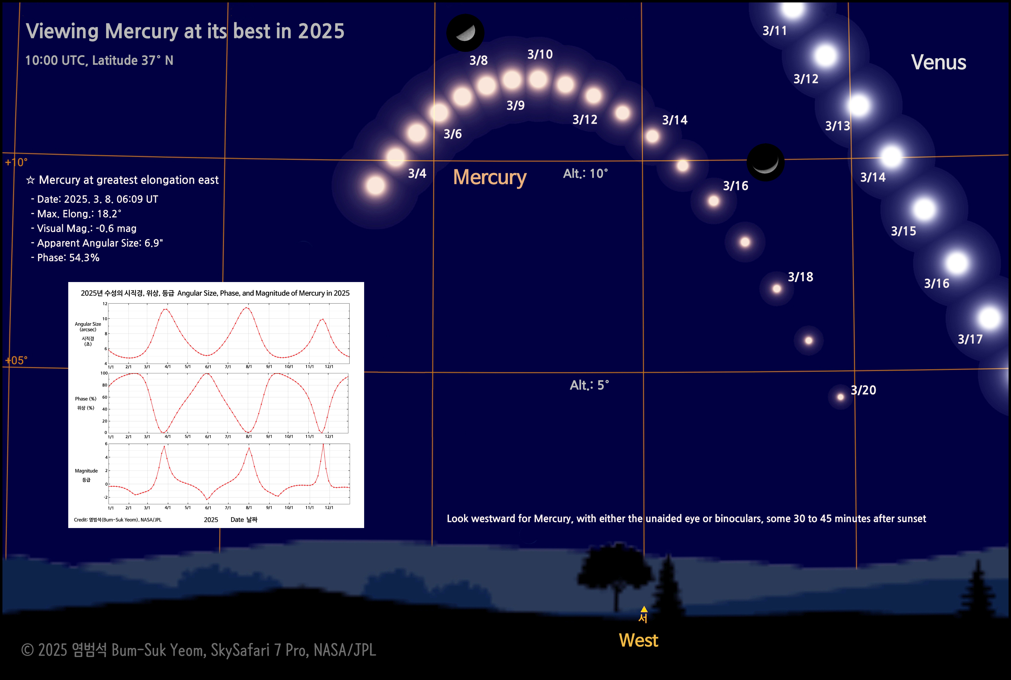 수성과 금성의 위치 변화 (19:00 KST, 북위 37° 기준).