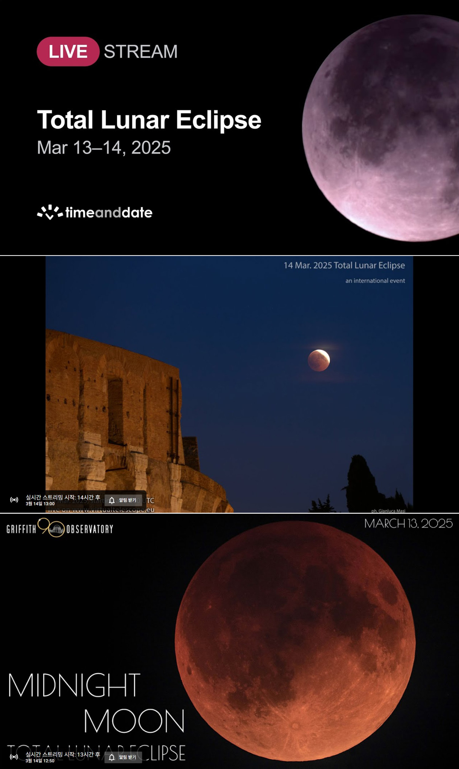 https://www.timeanddate.com/live/eclipse-lunar-2025-march-14 (3월 14일 14:00 KST 시작)