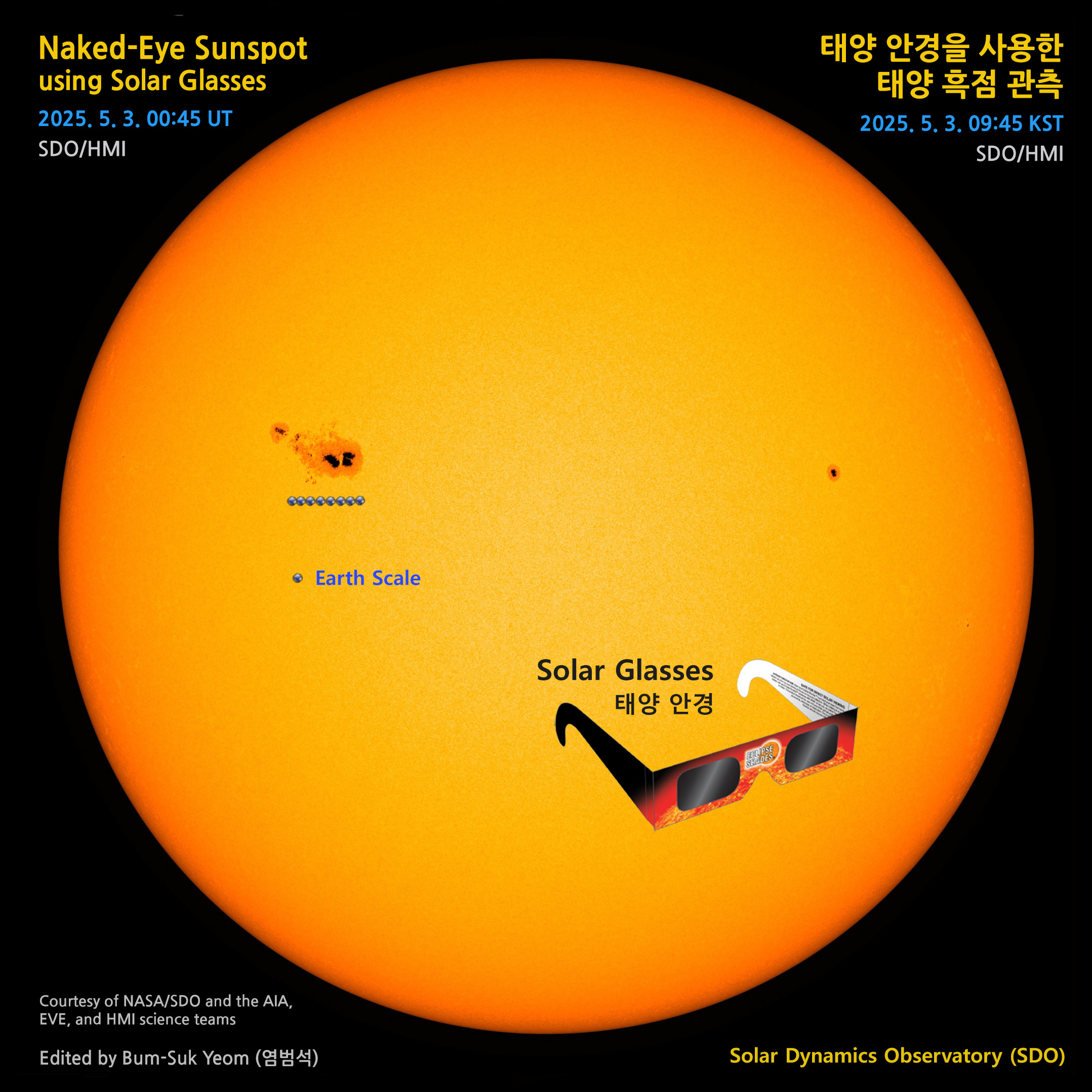 | Naked-Eye Giant Sunspot using Solar Glasses (or Solar Filter) 태양 안경을 사용하여 맨눈으로 관측 가능한 큰 태양 흑점 (0) | 2025.05.02 |