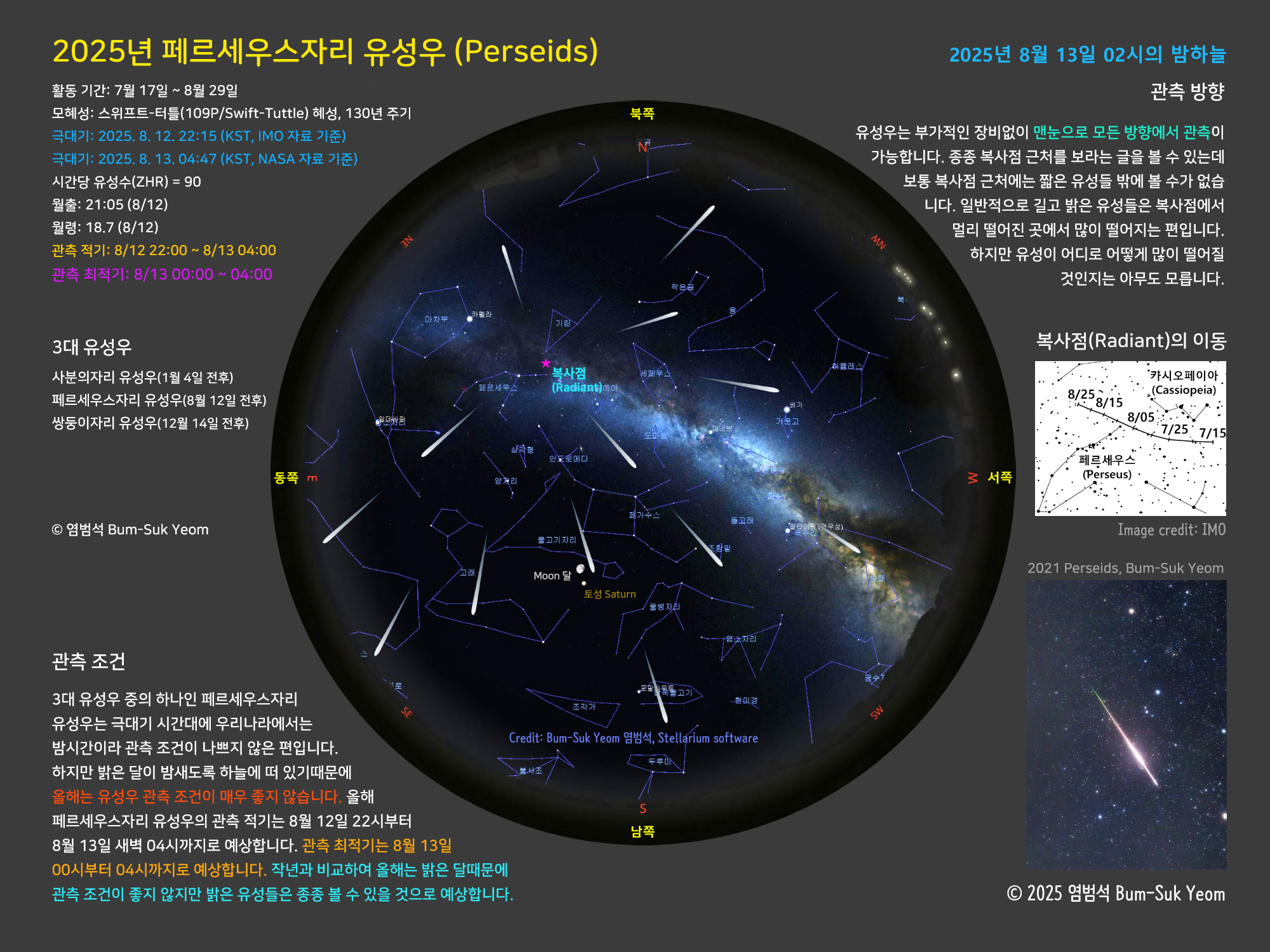 페르세우스자리 유성우(Perseid meteor shower, Perseids)는 3대 유성우 중의 하나로 매년 8월 12일 전후로 극대기를 가지며 많은 유성을 볼 수 있습니다. 이 유성우의 모혜성은 약 130년의 주기를 가진 스위프트-터틀(109P/Swift-Tuttle) 혜성입니다. 이 혜성이 지나간 자리를 지구가 지나가면서 유성우가 발생하게 됩니다. 올해 페르세우스자리 유성우 예측은 2025년 8월 12일 22시 15분(한국시간, 국제유성기구 IMO 자료 기준)과 8월 13일 04시 47분(한국시간, NASA 자료 기준)에 극대기를 가지고, 시간당 90개의 유성을 볼 수 있을 것으로 예측하고 있습니다. 유성이 가장 많이 떨어지는 극대기에 우리나라는 밤이라서 극대기 시간은 좋은 편이지만 밝은 달이 밤새도록 떠 있기때문에 전체적인 관측 조건은 좋지가 않습니다.