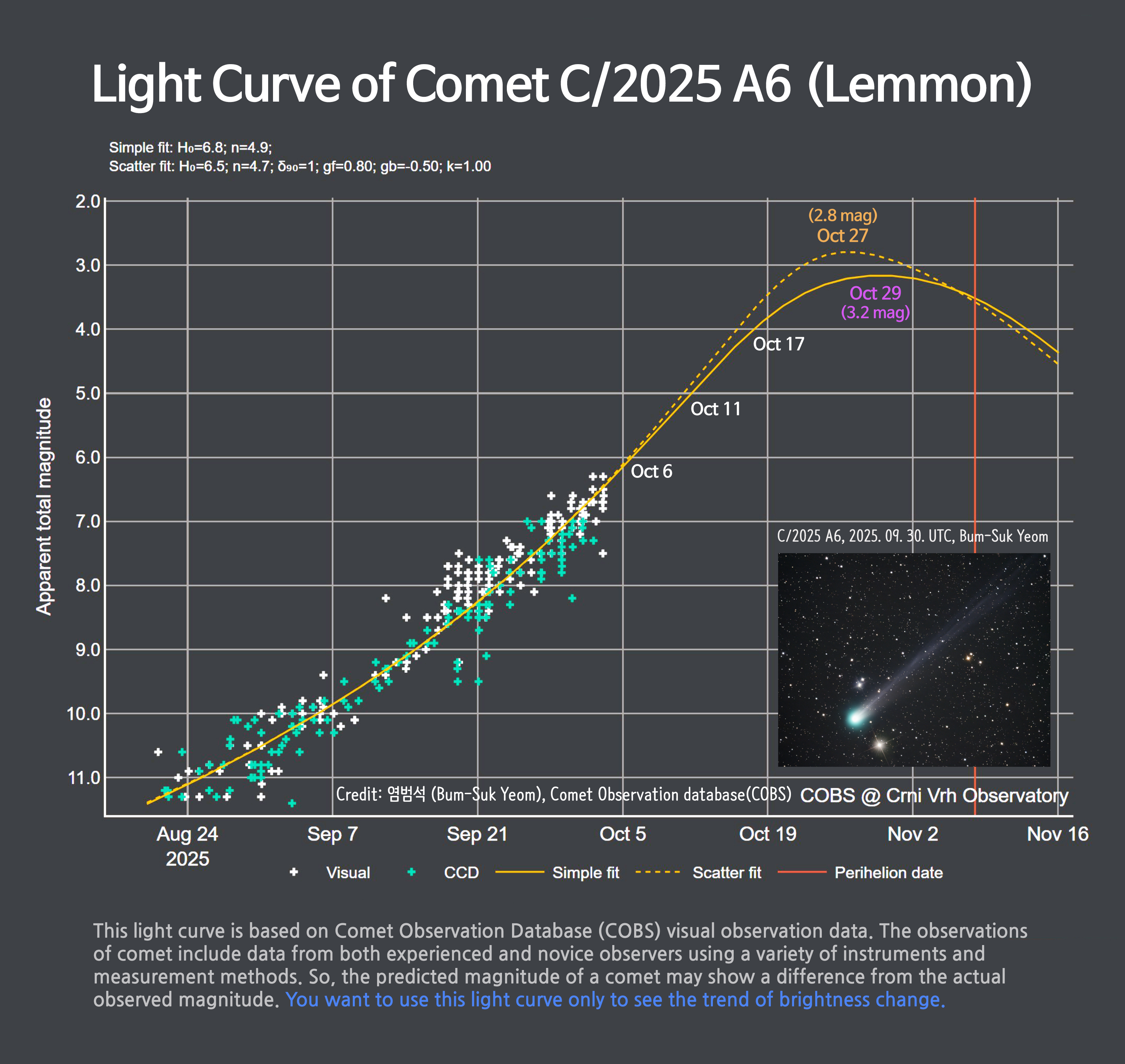 C/2025 A6 (레몬) 혜성은 올해 10월 말에 최대 밝기가 약 2~3등급이 될 것으로 예상합니다.