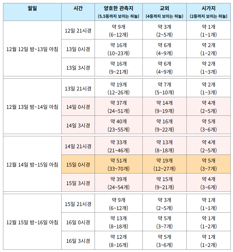아래 사진은 2025년 쌍둥이자리 유성우에서 실제로 볼 수 있는 시간당 예상 유성수입니다. 극대일 전후에, 실제로 볼 수 있는 것으로 예상되는 유성의 수입니다. 유성의 개수는 한 사람이 시간당 볼 수 있는 유성수로 환산한 것입니다. 어디까지나 예상이기때문에 실제 관측과 차이가 날 수도 있습니다.