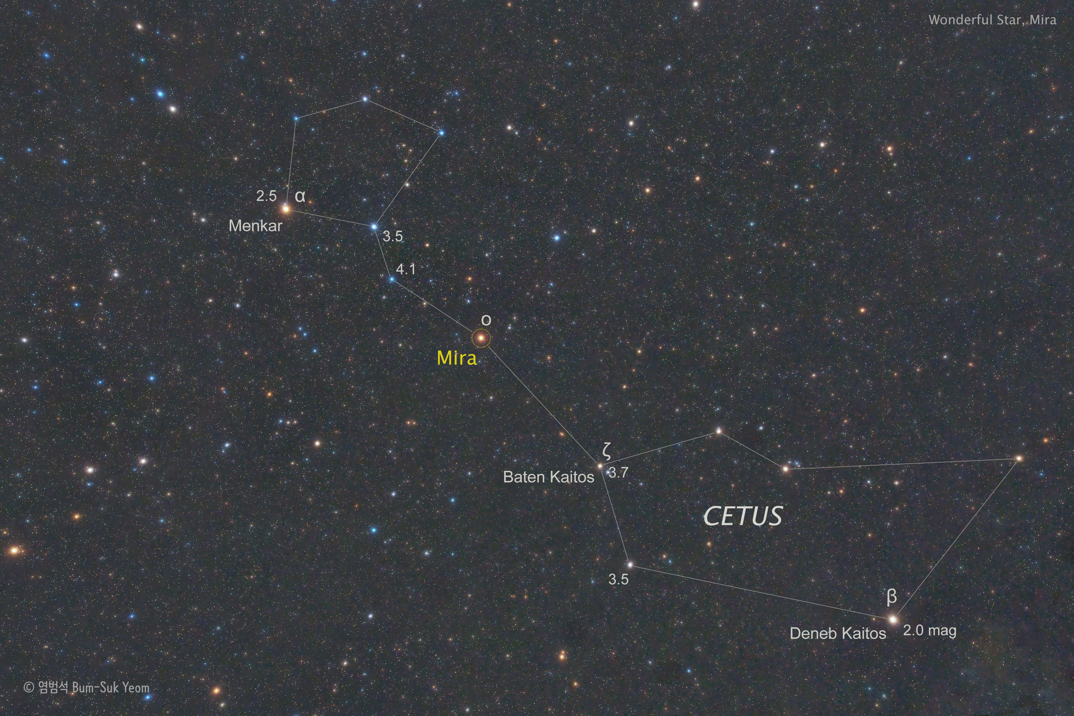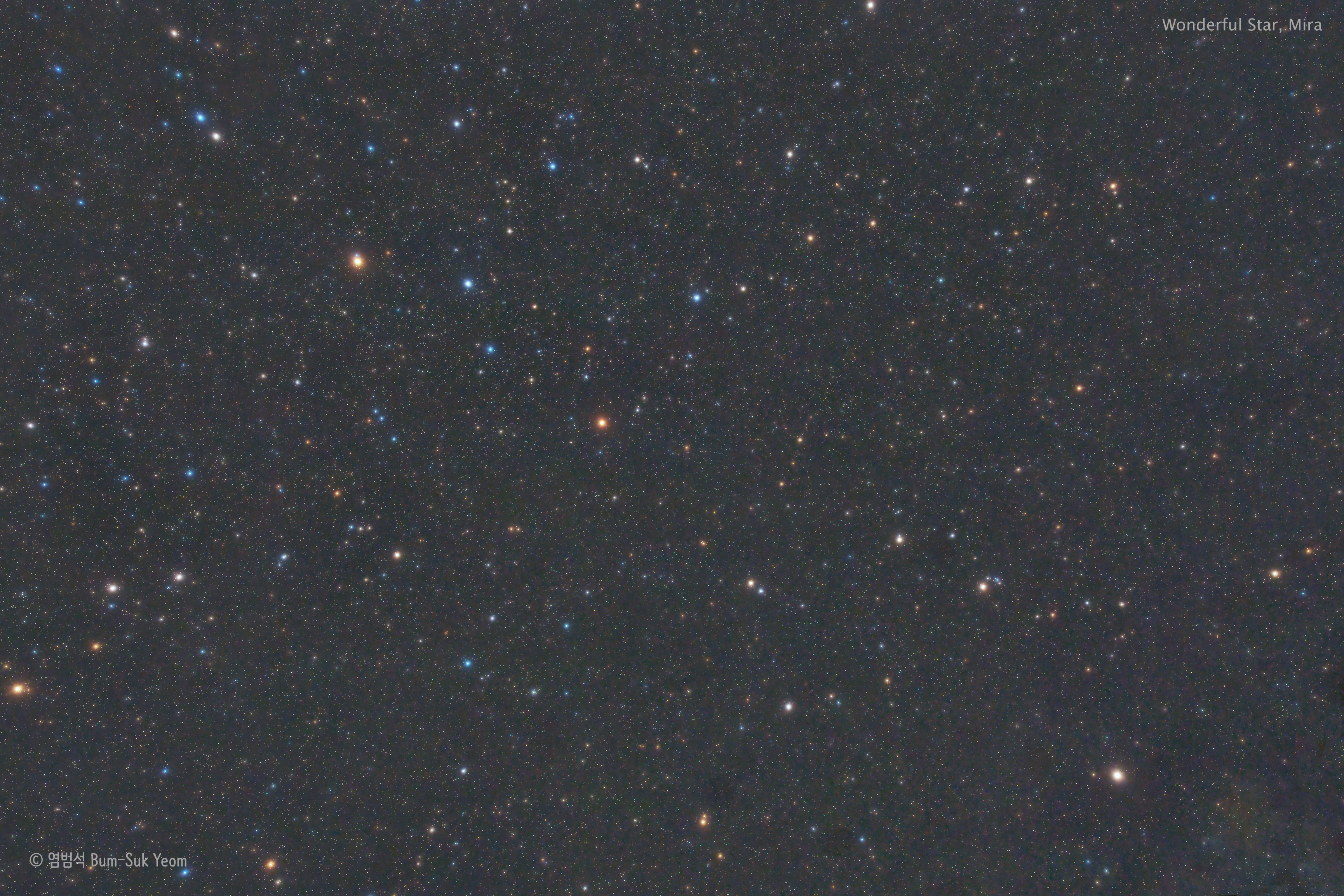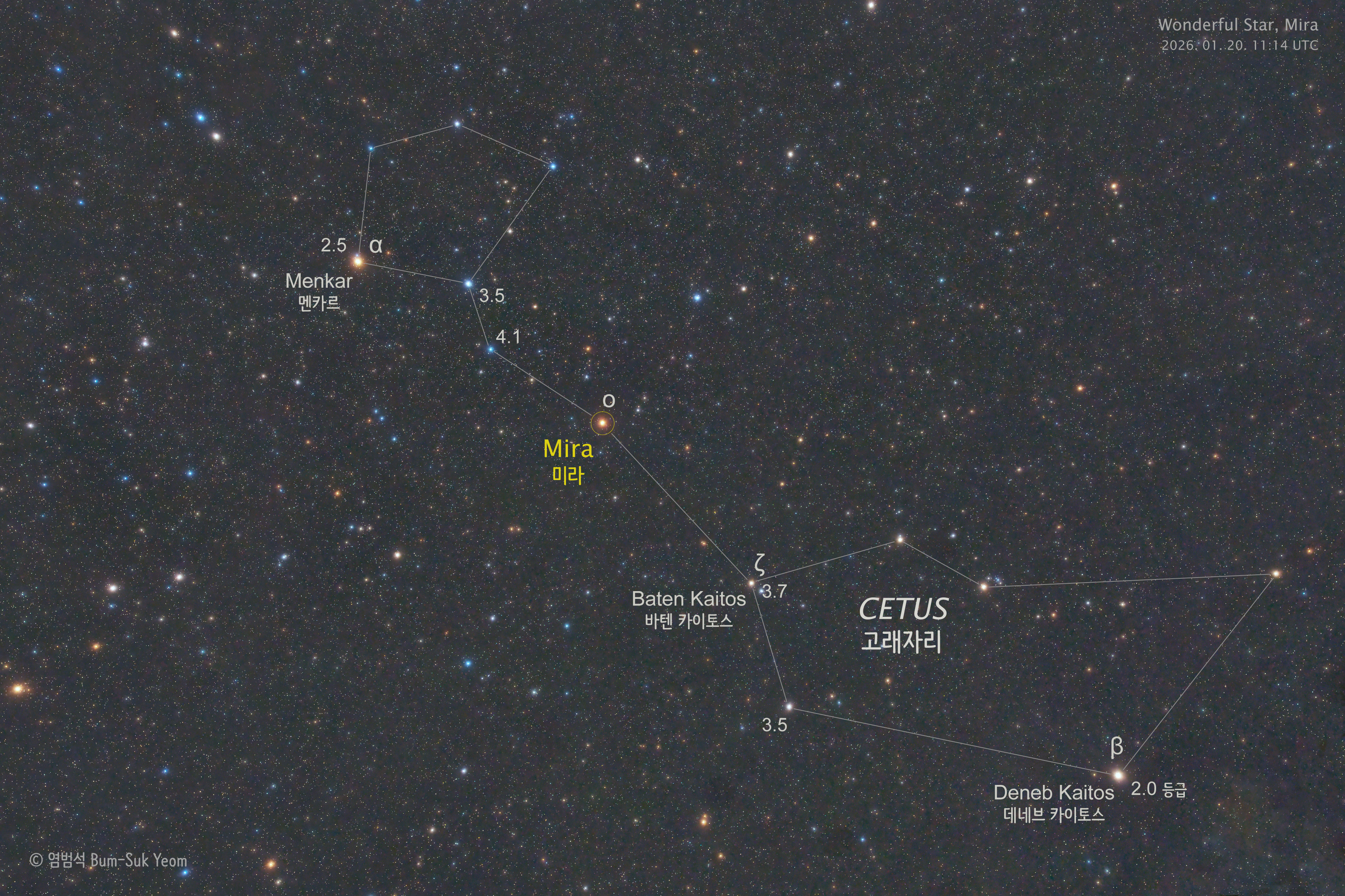 미라는 고래자리(Cetus)에 위치한 가장 유명한 변광성(Variable Star)으로, "놀라운 별"이라는 뜻의 이름을 가지고 있습니다. 1662년에 폴란드 천문학자인 요하네스 헤벨리우스가 이 별에 라틴어로 "놀라운" 또는 "경이로운"을 의미하는 '미라(Mira)'라는 이름을 붙였습니다. 미라는 최초로 발견된 맥동 변광성입니다. 이 별의 밝기는 약 332일 주기로 8등급에 걸쳐 변화합니다. 이 사진은 미라 변광성의 극대기인 2026년 1월 20일에 대한민국의 장수에서 촬영한 사진입니다. 2026년 1월 말 기준으로 미국 변광성 관측자 협회 (AAVSO)에 보고한 대부분의 관측자들은 미라의 밝기를 3.1~3.3등급으로 보고 있습니다. 미라의 최대 밝기는 2026년 2월 초로 예상합니다.