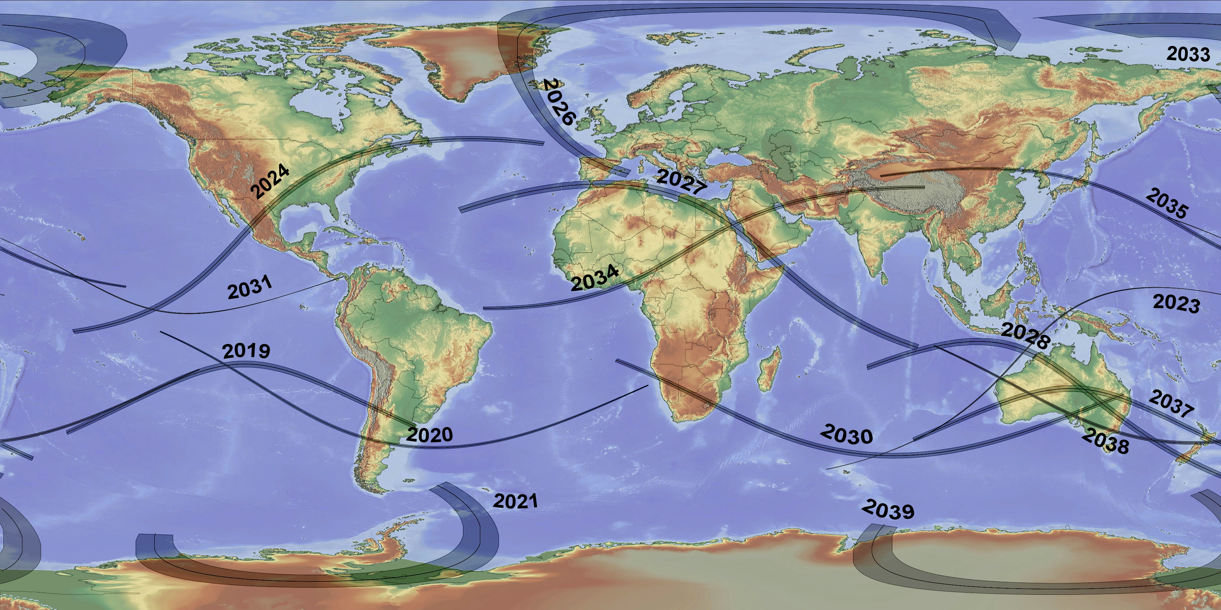 Paths of all total solar eclipses in the period 2019–2040.