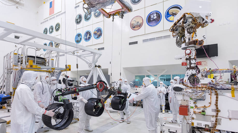In this image, taken on June 13, 2019, engineers at NASA's Jet Propulsion Laboratory in Pasadena, California, install the starboard legs and wheels — otherwise known as the mobility suspension — on the Mars 2020 rover. They installed the port suspension later that day.