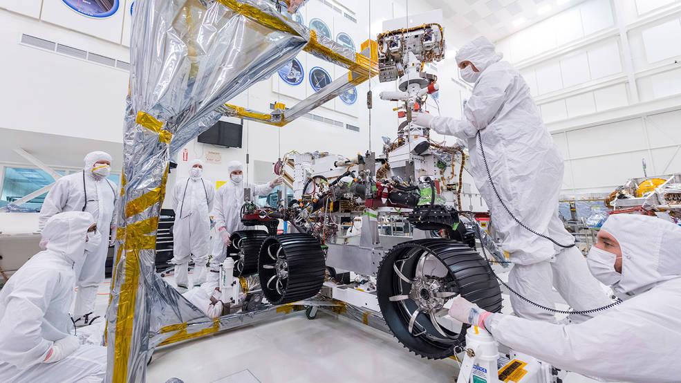 2019년 6월 13일에 촬영된 사진에서 나사의 제트추진연구소(JPL)의 기술자들이 로버의 바퀴를 조립하고 있다.