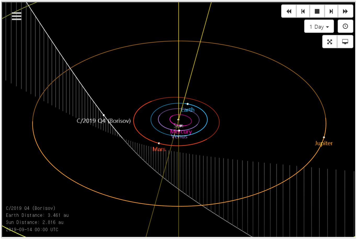2019년 8월 30일에 보리소프(Gennady Borisov)가 자신이 직접 만든 0.65m 망원경을 이용하여 발견한 혜성입니다. 발견된 후 MPC(Minor Planet Center)에서 임시 번호(gb00234)를 부여했고 한국시간으로 9월 12일에 공식적인 이름(C/2019 Q4, Borisov)으로 확정했습니다. 이 혜성은 궤도 이심률이 약 3.7로 태양에 구속되지 않는 성간 혜성으로 예상하고 있습니다. 2019년 12월 6일에 태양에 가장 가까이 접근하며 태양으로부터의 거리는 약 2AU로 화성 궤도보다 더 가까이 태양에 접근하지 않습니다. 이 혜성의 밝기는 현재 약 17등급대(9월 중순 기준)입니다. 12월에 15등급까지 밝아질 것으로 예상하고 있습니다.