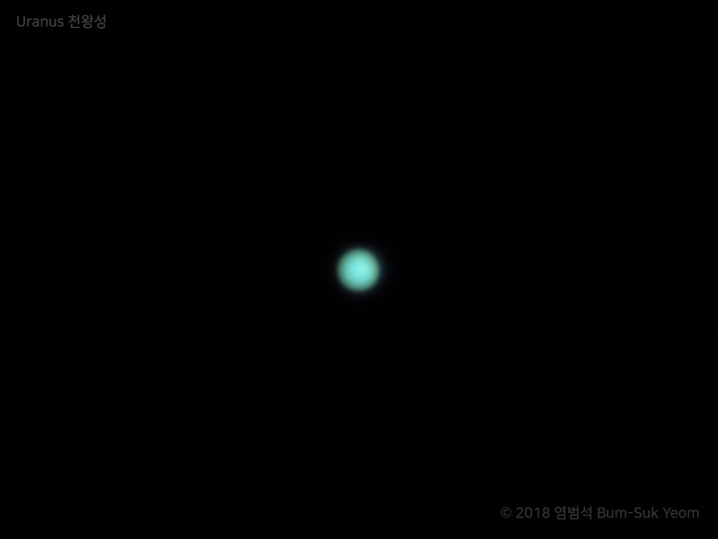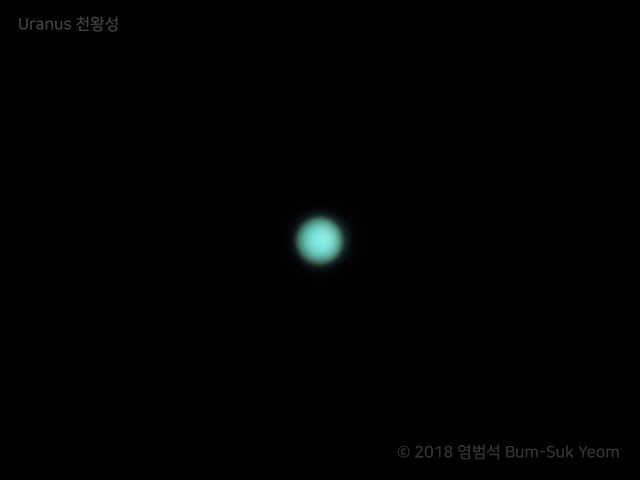 천왕성, 2018년 8월 15일 02:33, 304mm 굴절 망원경, ZWO ASI224MC 카메라, 3배 바로우 렌즈, ZWO ADC, 5분 동영상 x 2 = 10분 노출 (11,757장 사진 합성), 익산시.