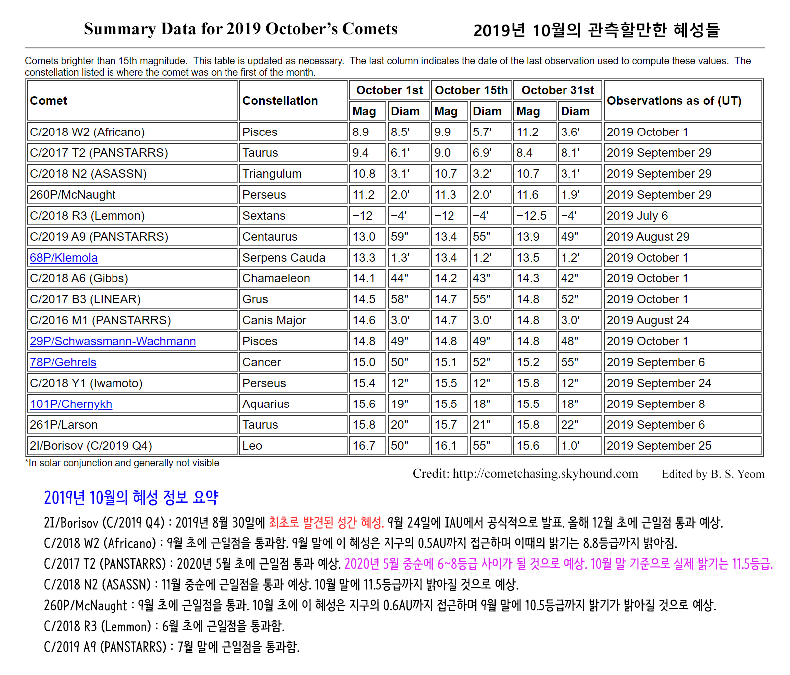 | Summary Data for 2019 November’s Comets 2019년 11월의 주요 혜성들 (0) | 2019.11.07 |