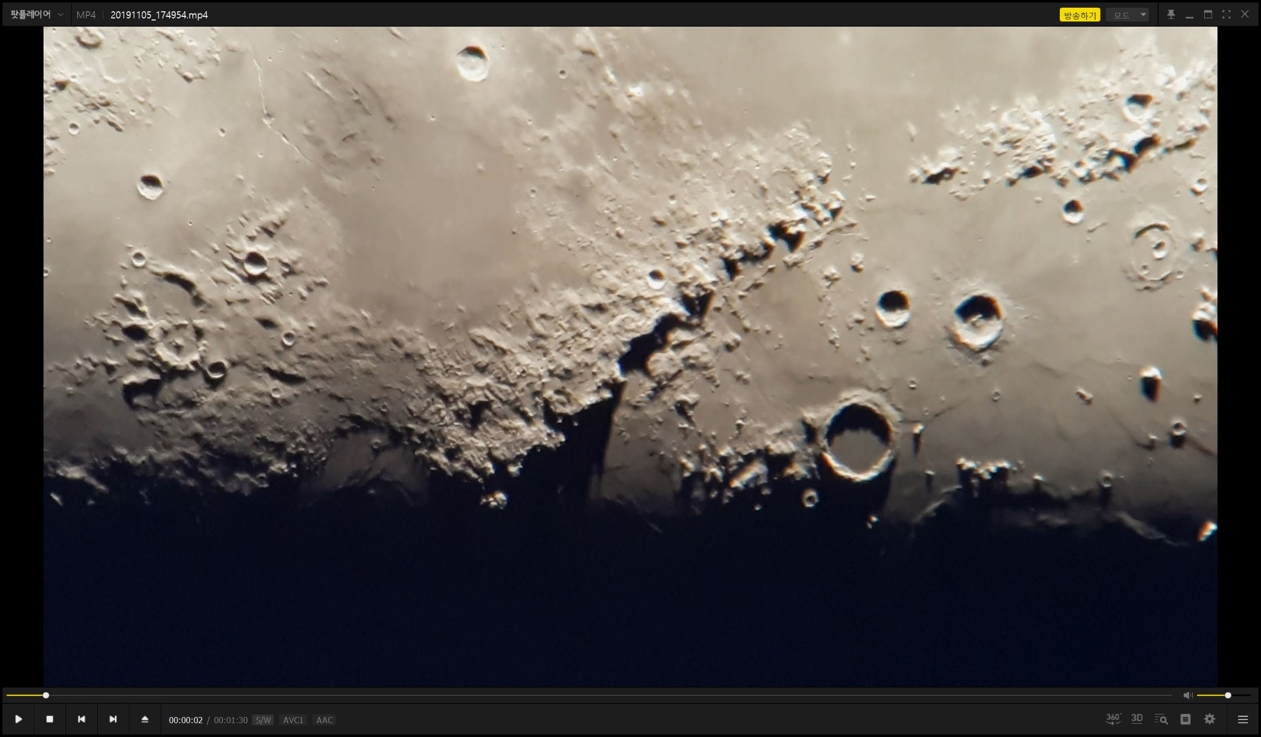 스마트폰을 손으로 들고 천체 망원경의 접안렌즈 부분으로 찍어서 흔들림도 있고 공기의 움직임에 따른 상의 일렁거림도 있습니다. 테스트 동영상.