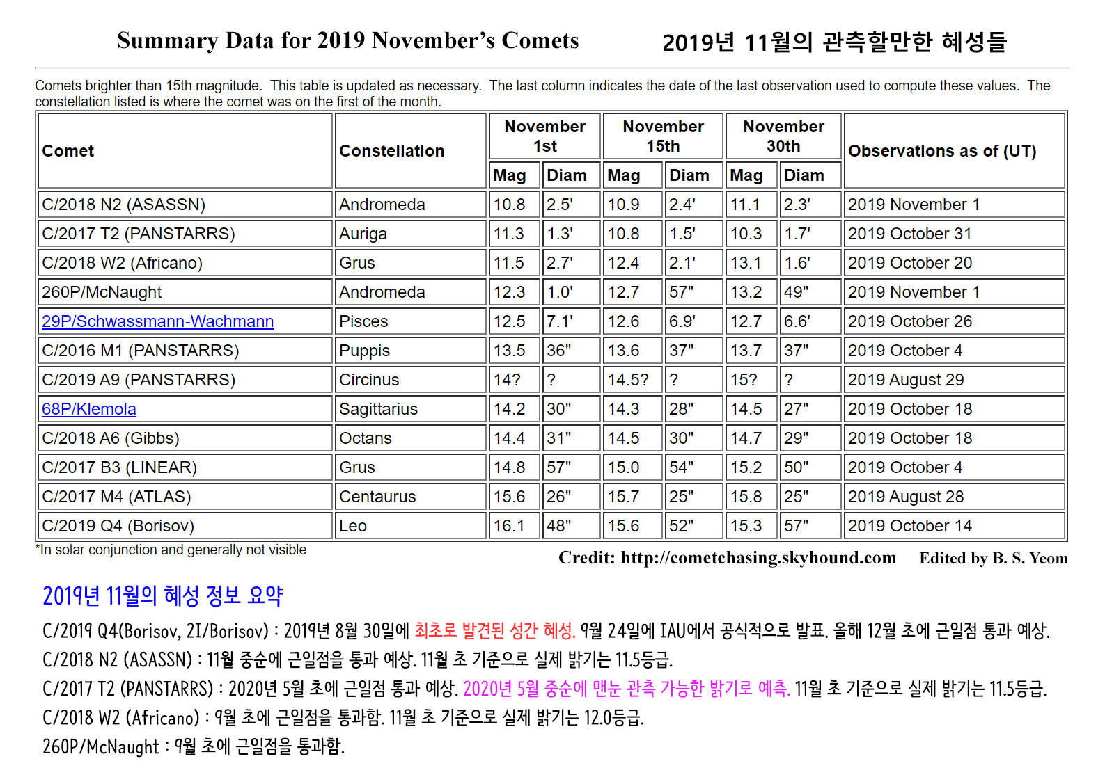 | Summary Data for 2019 December’s Comets 2019년 12월의 주요한 혜성들 (0) | 2019.12.03 |